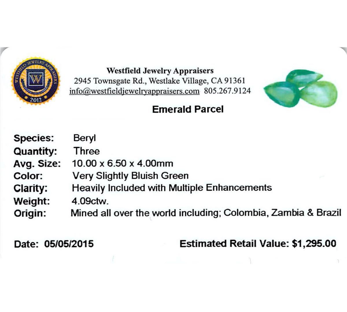 Three pear mixed cut natural emeralds, measuring 10.00 x 6.50 x 4.00mm, exact total weight 4.09ct., clarity is heavily included, type III, medium dark, very slightly grayish, very slightly bluish green color, (GIA vslbG 6/3), cut is good. Indications of multiple laboratory enhancements, including high temperature heat treatment. Westfield Appraised at $1,770.00.