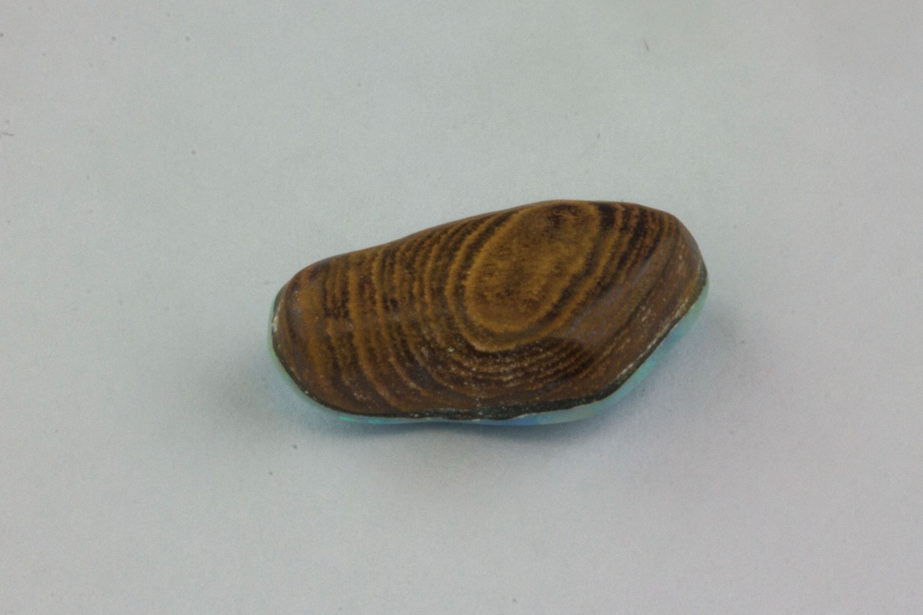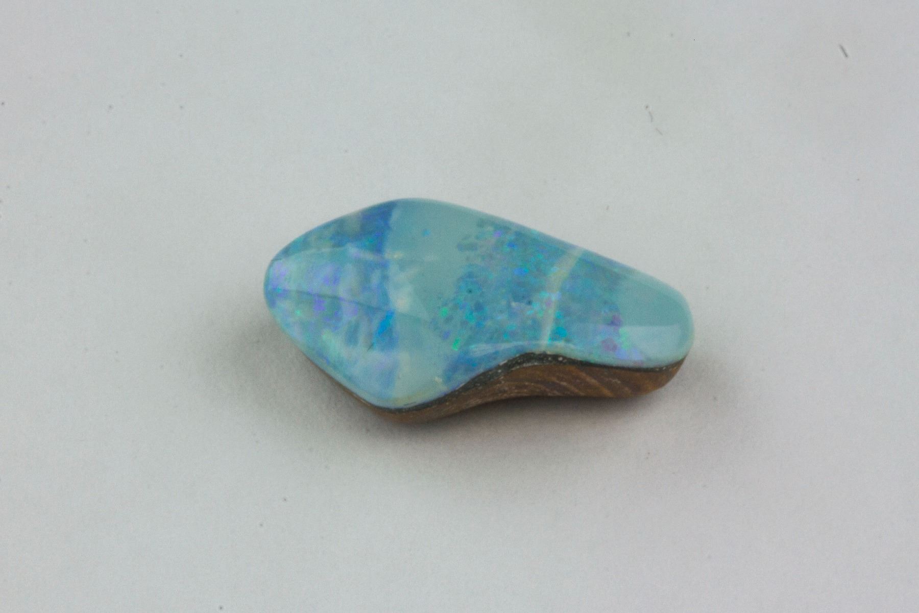 Genuine opal doublet gemstone; with wood and brilliant blue color; replacement value $200; 1.5 cm x 0.7 cm, 4.0 ct