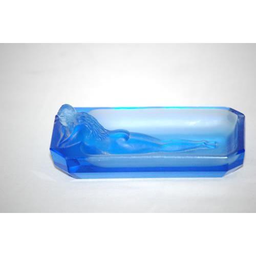 4 1/2" BLUE FRENCH ART GLASS DISH W/ RECLINING NUDE FEMALE-UNMARKED, FROSTED FINISH (4 1/2" L X 2 1/4" W)- SEVERAL TOP RIM CHIPS & ROUGHNESS