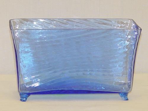 4 1/2" FRENCH BLUE STEUBEN FOOTED RECTANGULAR VASE- UNSIGNED (4 1/2" T X 7 3/4" L X 4" W) - SMALL CHIPS ON FEET, GROUND SMALL CHIP ON TOP RIM