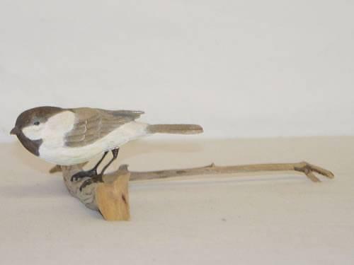 4 1/2" MINIATURE CHICKADEE BIRD CARVING ON A TWIG BASE SIGNED DON HILLMAN