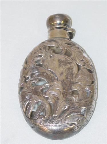 4 1/2" SILVER OVERLAY FLASK-HARRIET - UNMARKED SILVER, SMALL CRACK IN NECK AT TOP RIM, TARNISHED