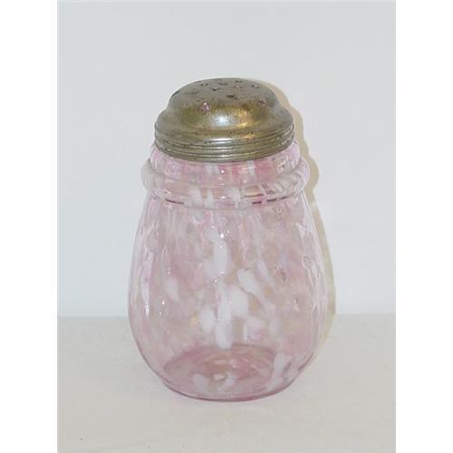 4 1/2" VICTORIAN SUGAR SHAKER - RING NECK PINK & WHITE SPATTER W/ TIN LID - WEAR TO LID