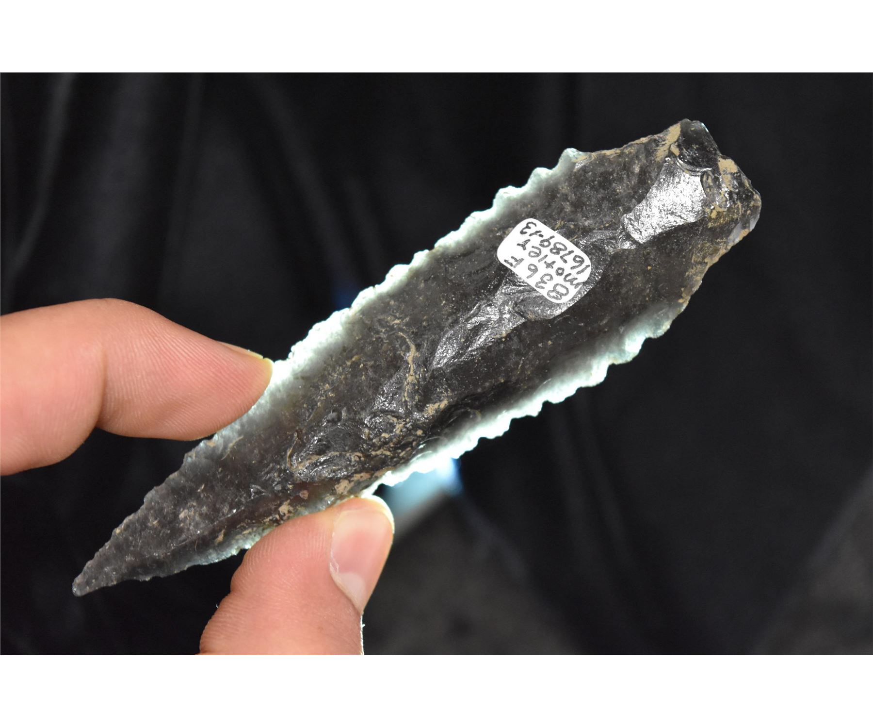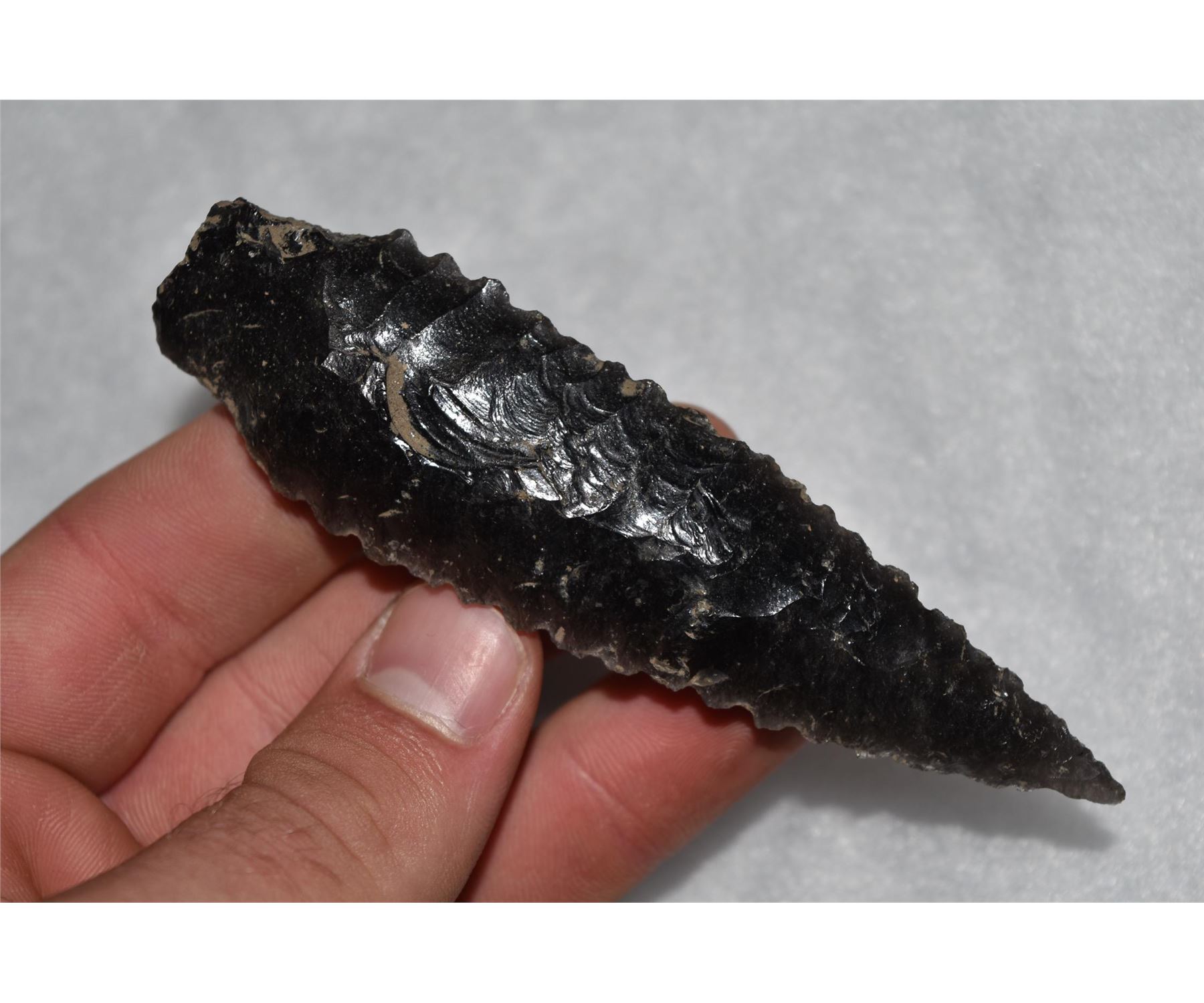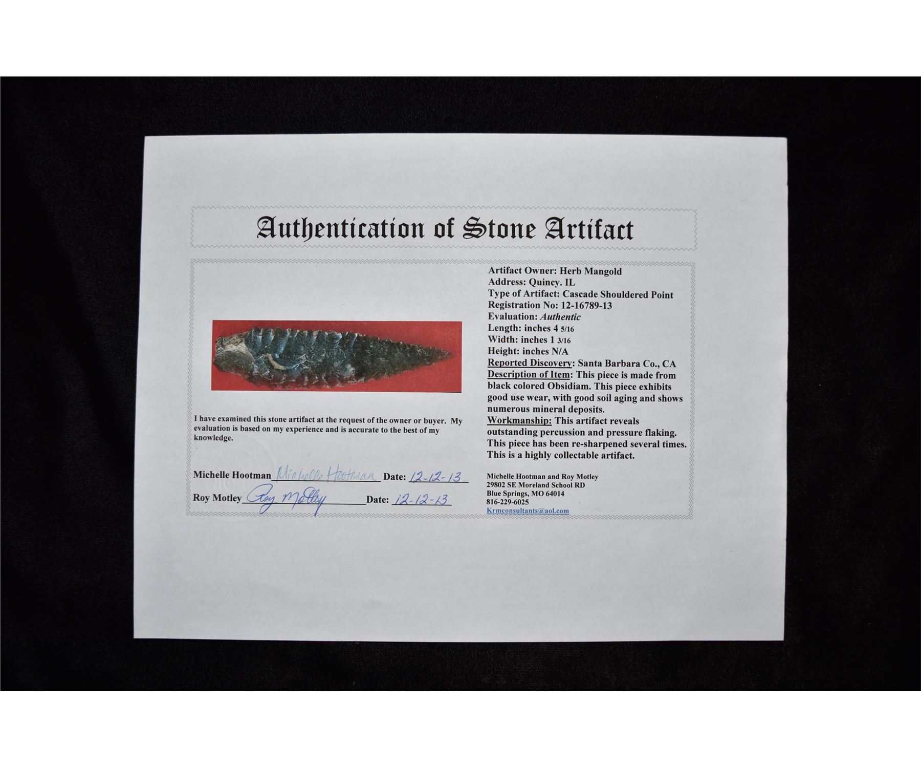 5 1/4" Cascade Shouldered, Motley COA, Santa Barbara Co, California, Obsidian, Well made and serrated, Herb Mangold Collection