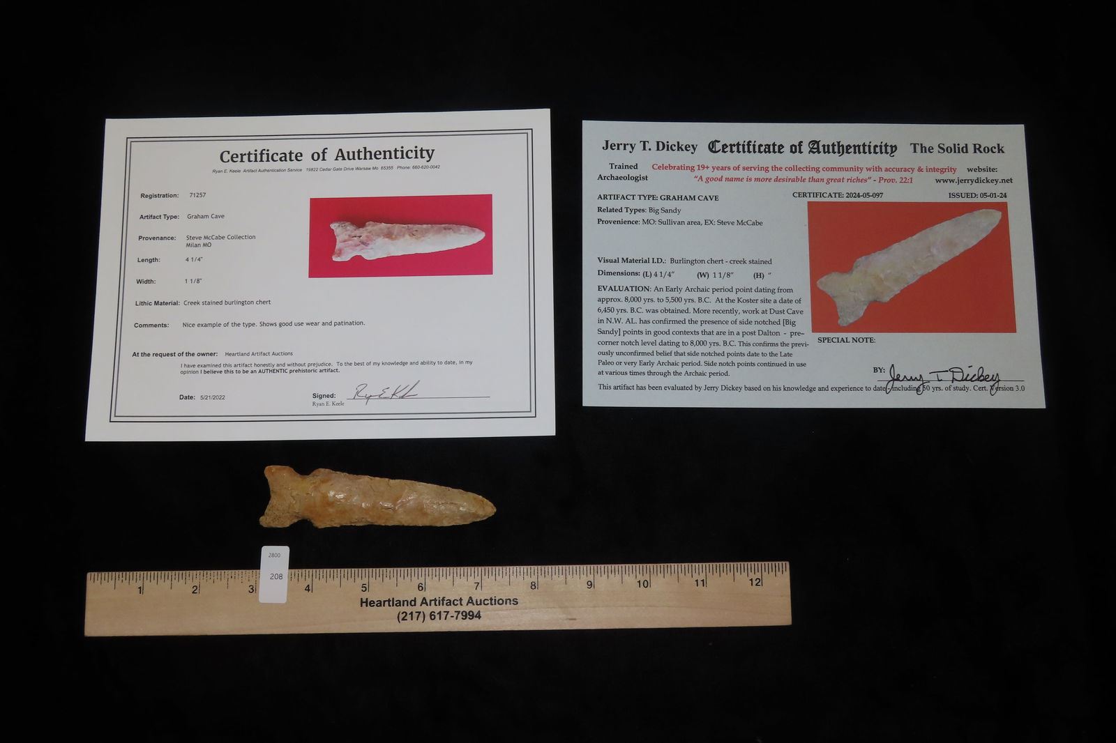 4 1/4& quot; Graham Cave, Keele/Dickey COA, Found in Milan Co. Missouri, Ex Steve McCabe Collection