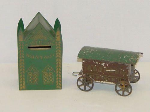 4 1/4" PAINTED TIN BUILDING FORM PENNY BANK "HASTE NOT-WANT NOT" (PAINT WEAR) TOGETHER W/ EARLY PAINTED TIN TRAIN CAR PULL TOY-U.P.R.R. (PAINT LOSSES & WEAR)