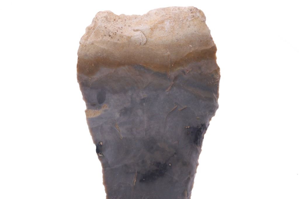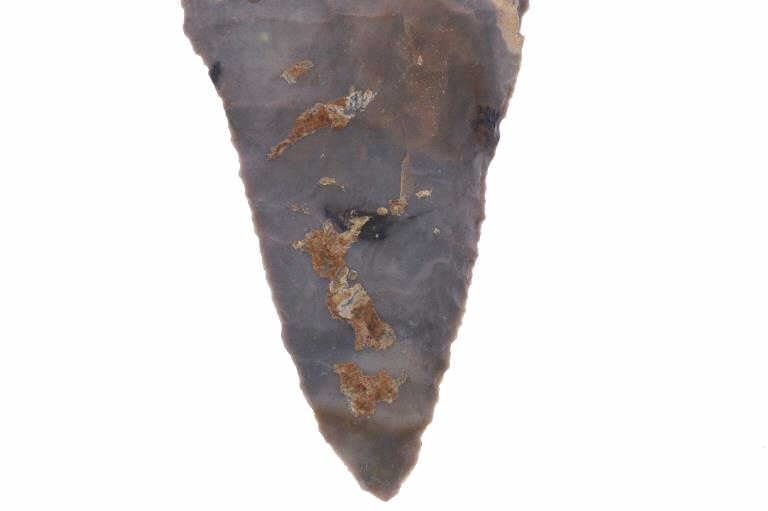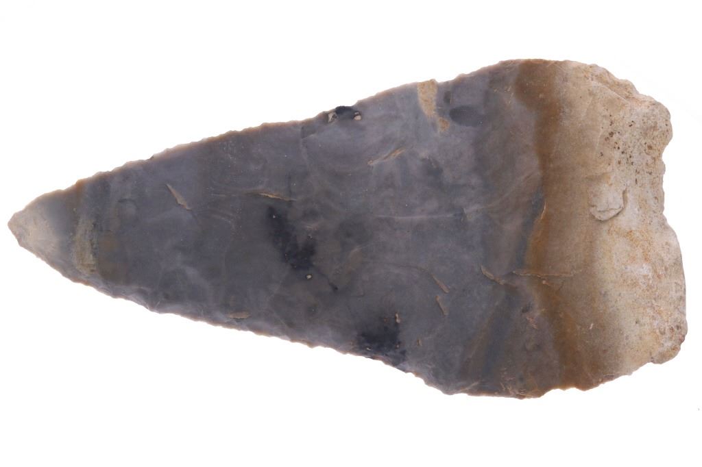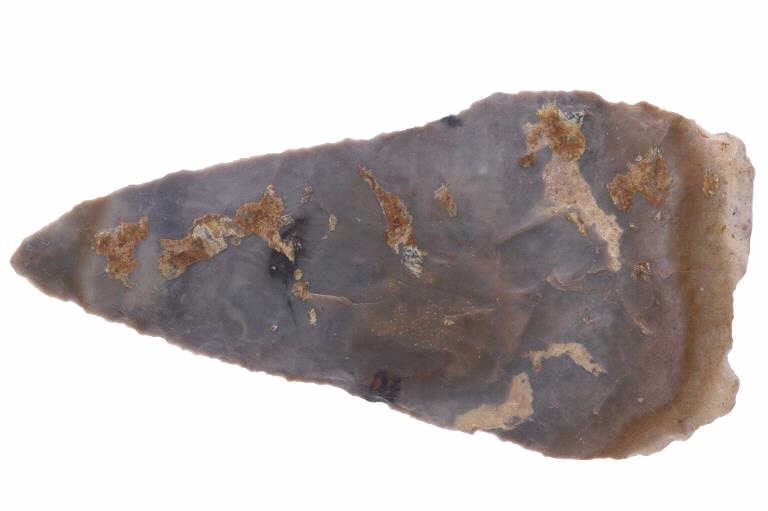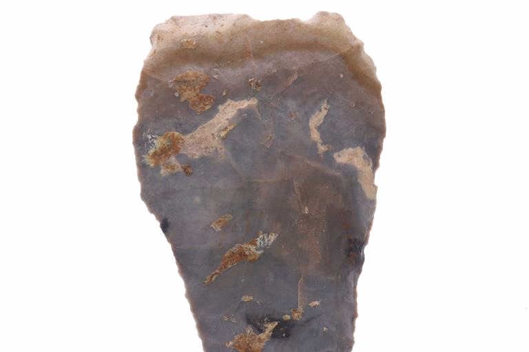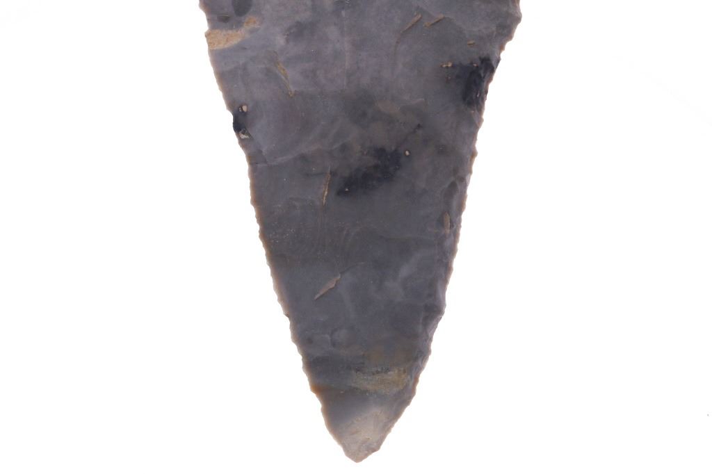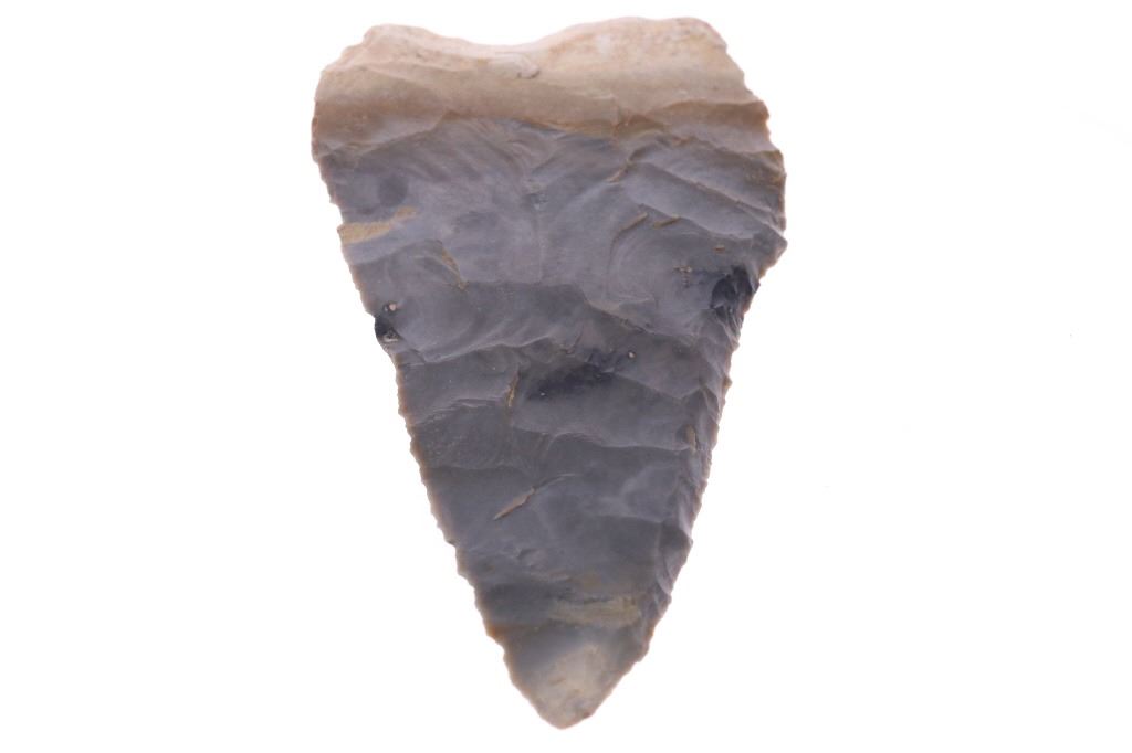 Featured in this lot is this 4 1/4" San Gabriel bi-face projectile point Transitional Archaic approximately dating 1,800 - 1,500 B.P. the point features a wonderfully and professionally crafted fully knapped flint material construction that shows a triangular shape with a bi face design and rounded shoulders with a serrated blade. The condition of this projectile point is well preserved with no obvious signs of damage and shows a well preserved overall condition. The measurements of this point is 4 1/4" x 2 1/4". The collective weight of this point is 56.7g.
