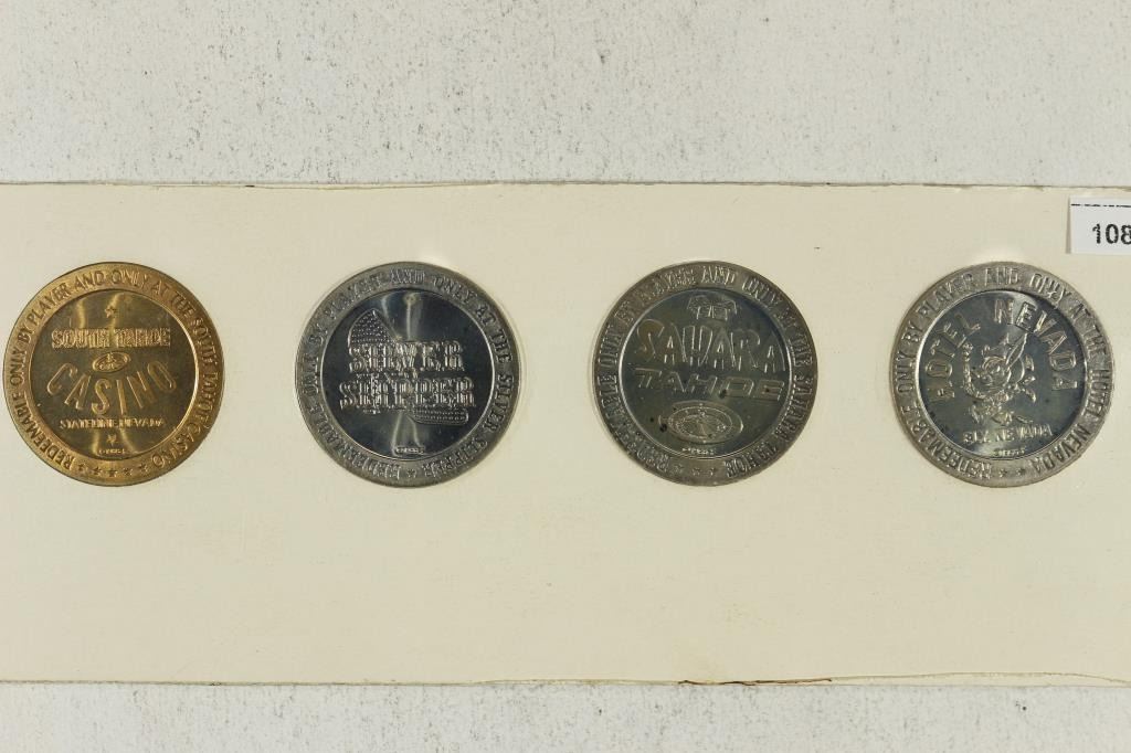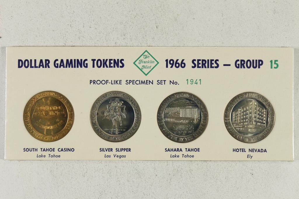 SPECIMEN SET. SOUTH TAHOE CASINO (LAKE TAHOE), SILVER SLIPPER (LAS VEGAS, NEVADA), SAHARA TAHOE (LAKE TAHOE) AND HOTEL NEVADA (ELY). ORIGINAL FRANKLIN MINT PACKING