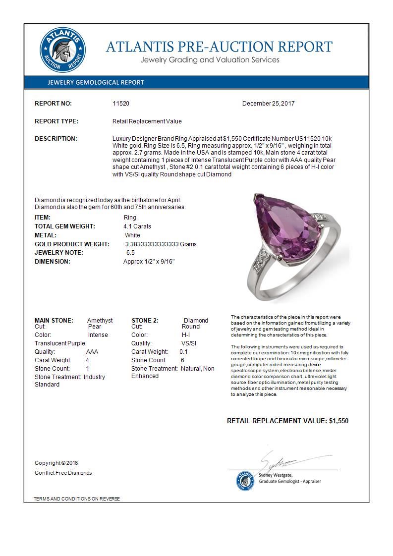 REF-23W3F -11520 ---- 4.10 CTW Amethyst & Diamond Ring 10K White Gold ---- Luxury Designer Brand Ring Appraised at $1,550 Certificate Number US11520 10k White gold, Ring Size is 6.5, Ring measuring approx. 1/2" x 9/16" , weighing in total approx. 2.7 grams. Made in the USA and is stamped 10k, Main stone 4 carat total weight containing 1 pieces of Intense Translucent Purple color with AAA quality Pear shape cut Amethyst , Stone #2 0.1 carat total weight containing 6 pieces of H-I color with VS/SI quality Round shape cut Diamond