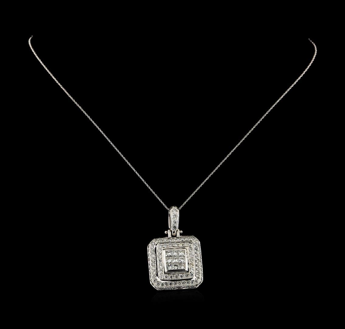 One electronically tested 18KT white gold ladies cast & assembled diamond pendant with chain. The pendant features a series of tiered diamond bezels, completed by a diamond set bail. The pendant is supported by a sixteen inch length 14KT white gold link chain, terminating in a spring ring clasp. Bright polish finish with milgrain detailing. Identified with markings of "18K". Condition is good. Containing: Nine invisible set princess cut diamonds, measuring 2.90 x 2.80 x 2.10mm (depth est.) approximate total weight of 9 Stones = 1.35ct. Graded in the setting. Clarity: SI-1 to SI-2. Color: G - H Five bead set round brilliant cut diamonds, measuring 2.20 - 2.20 x 1.32mm (depth est.) approximate total weight of 5 Stones = 0.25ct. Graded in the setting. Clarity: SI-2 to I-1. Color: G - H One Hundred Four bead set round brilliant cut diamonds, measuring 1.90 - 1.80 x 1.11mm (depth est.) approximate total weight of 104 Stones = 2.50ct. Graded in the setting. Clarity: SI-2 to I-1. Color: G - I. Total Weight of Diamonds 4.10ct. Total Weight of Pendant With Chain 13.50gm. AIG Appraised at $14,130.00.