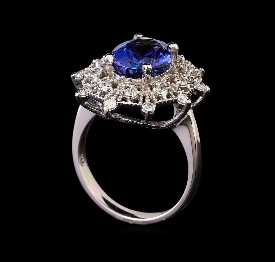 One electronically tested 14KT white gold lady's cast fashion ring with a double basket halo with a bright polish with milgrain detailing finish. The featured lady's ring has a shank measuring 2.67 millimeters in width. Identified with markings of 'K14'. Condition is new, good workmanship. Containing: One prong set oval modified brilliant cut natural tanzanite, measuring 10.89 x 8.84 x 5.90mm, (depth est.) approximate weight of 4.10ct., clarity is eye clean, medium, moderately strong, bluish violet color, (GIA bV 5/4), cut is very good. Transmitting light with no distortion, transparent. Colored gemstones are presumed to have been subjected to commonly used enhancement processes. Graded in the setting. Twenty prong set round brilliant cut diamonds, measuring 1.95 - 1.85 x 1.18mm (depth est.) approximate total weight of 20 Stones = 0.52ct. Graded in the setting. Clarity SI-1 to SI-2. Color: G - I Cut Good. Total Weight of Colored Stones 4.10ct.. Total Weight of Diamonds 0.52ct.. Total Weight of Ring 6.20gm. GAS Appraised at $8,485.00.