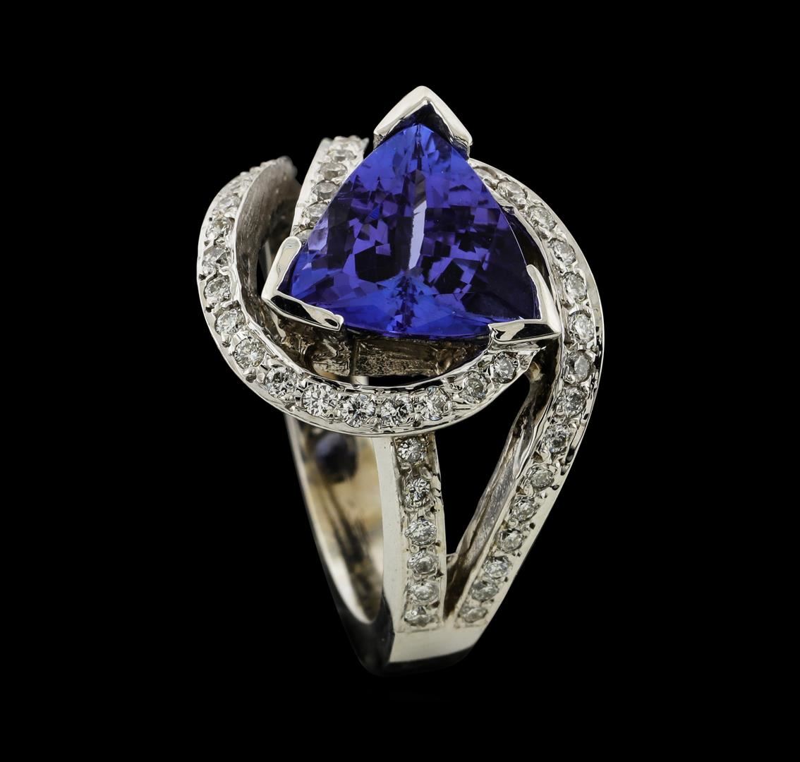 One electronically tested 14KT white gold lady's cast fashion ring with a bypass swirl with a bright polish finish. The featured lady's ring has a European shank measuring 3.60 millimeters wide. Identified with markings of '14K'. Condition is new, good workmanship. Containing: One prong set triangle modified brilliant cut natural tanzanite, measuring 11.00 x 10.75 x 5.75mm, (depth est.) approximate weight of 4.10ct., clarity is eye clean, medium, moderately strong, violet color, (GIA V 5/4), cut is very good. Transmitting light with no distortion, transparent. Colored gemstones are presumed to have been subjected to commonly used enhancement processes. Graded in the setting. Fifty-Two bead set round brilliant cut diamonds, measuring 1.40 - 1.30 x 0.84mm (depth est.) approximate total weight of 52 Stones = 0.50ct. Graded in the setting. Clarity VS-2 to SI-1. Color: H - I Cut Good. Total Weight of Colored Stones 4.10ct.. Total Weight of Diamonds 0.50ct.. Total Weight of Ring 10.50gm. GAS Appraised at $8,885.00.