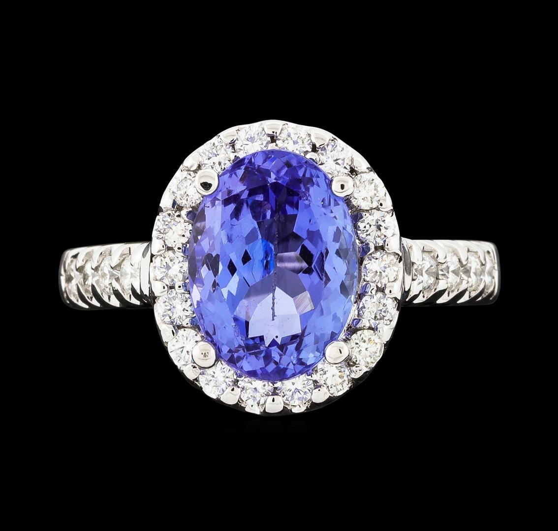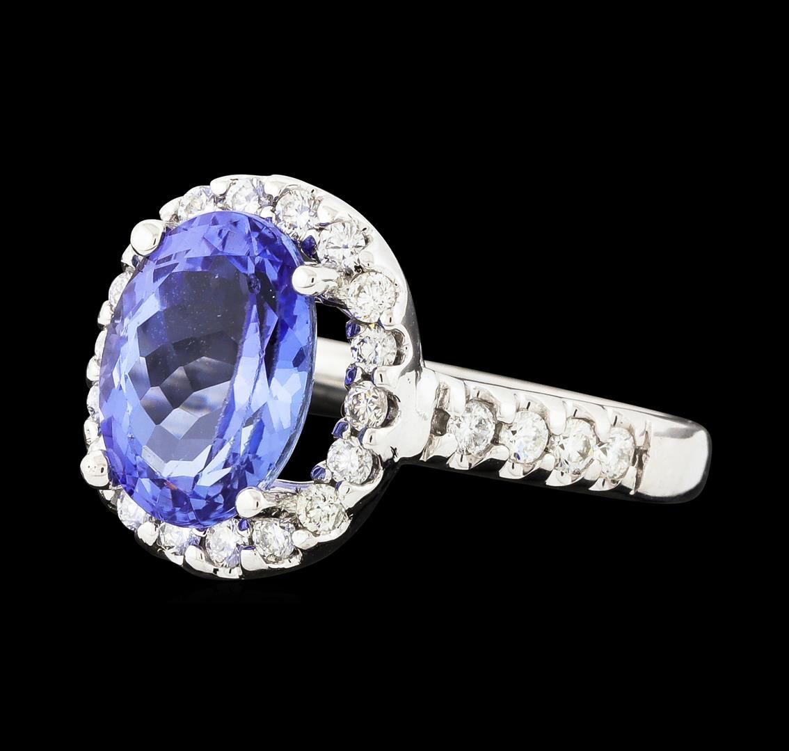 One electronically tested 14KT white gold lady's cast fashion ring with a basket halo with a bright polish finish. The featured lady's ring has a shank measuring 2.52 millimeters wide. Identified with markings of '14K'. Condition is new, good workmanship. Containing: One prong set oval modified brilliant cut natural tanzanite, measuring 11.14 x 8.08 x 5.61mm, (depth est.) 15%. bulge factor, approximate weight of 4.10ct., clarity is eye clean, medium light, moderately strong, violet color, (GIA V 4/4), cut is good. Transmitting light with no distortion, transparent. Colored gemstones are presumed to have been subjected to commonly used enhancement processes. Graded in the setting. Eight prong set round brilliant cut diamonds, measuring 2.00 - 1.90 x 1.19mm (depth est.) approximate total weight of 8 Stones = 0.22ct. Graded in the setting. Clarity SI-1 to SI-2. Color: H - I Cut Good Eighteen prong set round brilliant cut diamonds, measuring 1.80 - 1.70 x 1.09mm (depth est.) approximate total weight of 18 Stones = 0.38ct. Graded in the setting. Clarity SI-1 to SI-2. Color: H - I Cut Good. Total Weight of Colored Stones 4.10ct.. Total Weight of Diamonds 0.60ct.. Total Weight of Ring 6.60gm. GAS Appraised at $7,125.00.