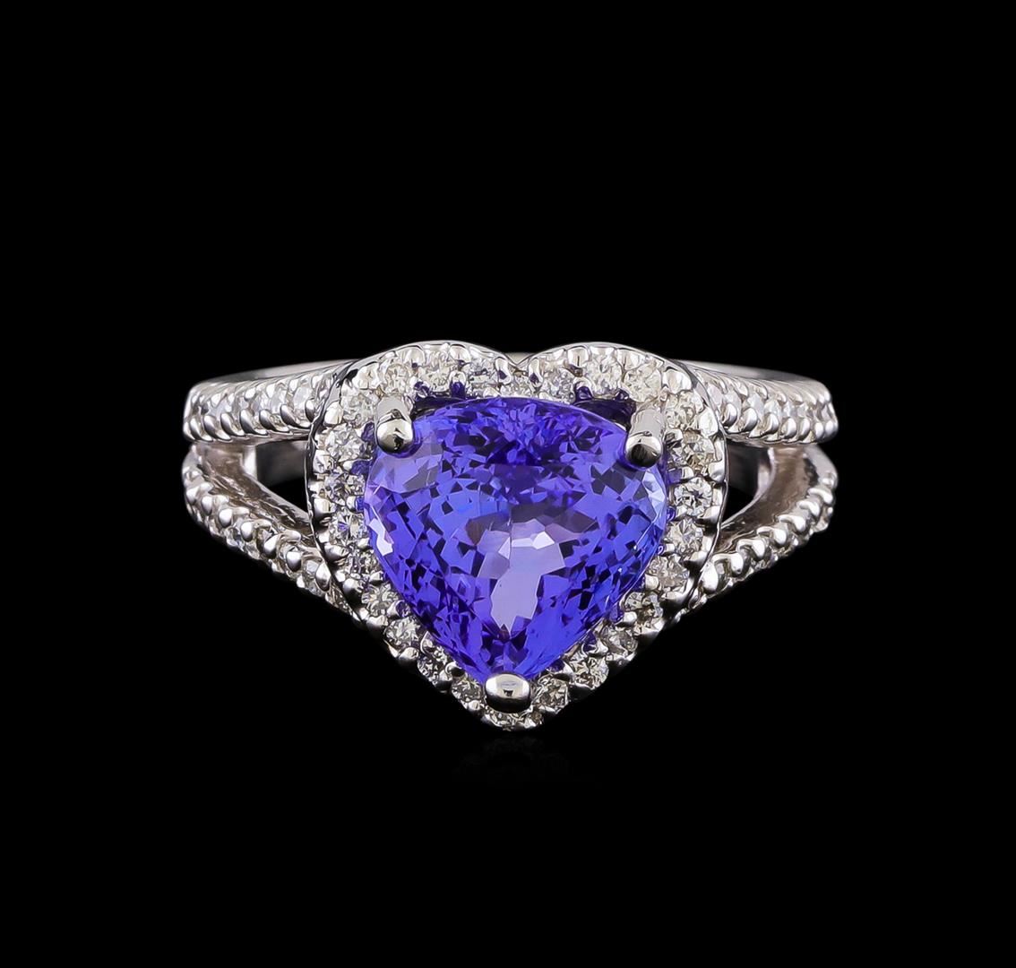 One electronically tested 14KT white gold lady's cast fashion ring with a split shank cathedral halo with a bright polish finish. The featured lady's has a heart shaped motif and a shank measuring 3.47 millimeters in width. Identified with markings of "14K". Condition is new, good workmanship. Containing: One prong set pear modified brilliant cut natural tanzanite, measuring 10.00 x 9.96 x 5.51mm, (depth est.) 5%. bulge factor, approximate weight of 4.10ct., clarity is eye clean, medium, moderately strong, bluish violet color, (GIA bV 5/4), cut is very good. Transmitting light with no distortion, transparent. Colored gemstones are presumed to have been subjected to commonly used enhancement processes. Graded in the setting. Twenty prong set round brilliant cut diamonds, measuring 1.20 - 1.15 x 0.74mm (depth est.) approximate total weight of 20 Stones = 0.13ct. Graded in the setting. Clarity: SI-1 to SI-2. Color: H - I. Cut Good Fifty-Eight prong set round brilliant cut diamonds, measuring 1.40 - 1.35 x 0.86mm (depth est.) approximate total weight of 58 Stones = 0.58ct. Graded in the setting. Clarity: SI-1 to I-1. Color: G - I. Cut Good. Total Weight of Colored Stones 4.10ct. Total Weight of Diamonds 0.71ct. Total Weight of Ring 9.10gm. GAS Appraised.