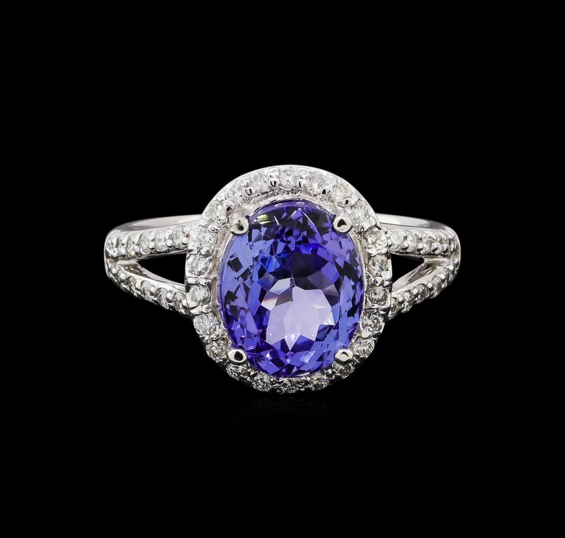 One electronically tested 14KT white gold lady's cast fashion ring with a basket halo with a bright polish finish. The featured lady's ring has a shank measuring 2.19 millimeters in width. Identified with markings of '14K'. Condition is new, good workmanship. Containing: One prong set oval modified brilliant cut natural tanzanite, measuring 10.37 x 8.60 x 5.95mm, (depth est.) 5%. bulge factor, approximate weight of 4.10ct., clarity is eye clean, medium light, very slightly grayish, violetish blue color, (GIA vB 4/3), cut is very good. Transmitting light with no distortion, transparent. Colored gemstones are presumed to have been subjected to commonly used enhancement processes. Graded in the setting. Fifty prong set round brilliant cut diamonds, measuring 1.40 - 1.35 x 0.86mm (depth est.) approximate total weight of 50 Stones = 0.51ct. Graded in the setting. Clarity SI-1 to I-1. Color: G - I Cut Good. Total Weight of Colored Stones 4.10ct.. Total Weight of Diamonds 0.51ct.. Total Weight of Ring 5.50gm. GAS Appraised at $7,045.00.