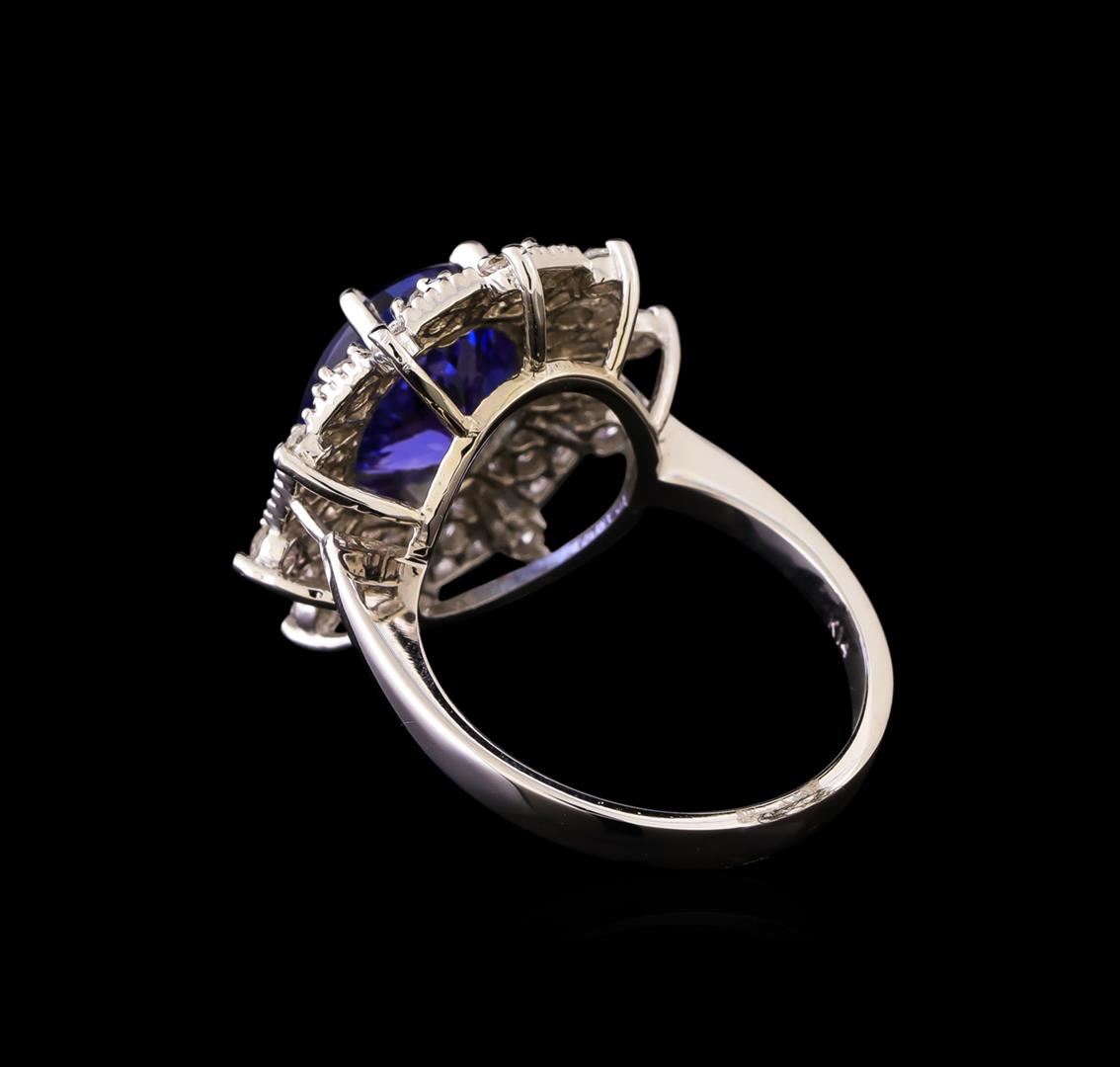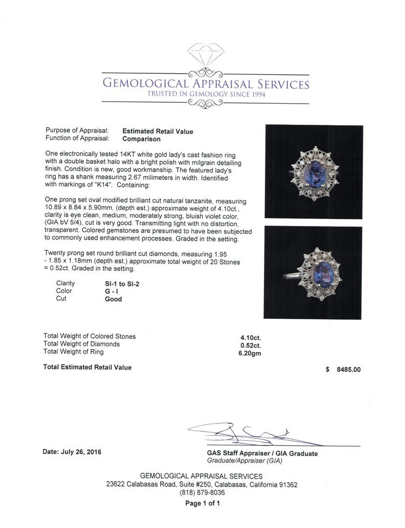 One electronically tested 14KT white gold lady's cast fashion ring with a double basket halo with a bright polish with milgrain detailing finish. The featured lady's ring has a shank measuring 2.67 millimeters in width. Identified with markings of 'K14'. Condition is new, good workmanship. Containing: One prong set oval modified brilliant cut natural tanzanite, measuring 10.89 x 8.84 x 5.90mm, (depth est.) approximate weight of 4.10ct., clarity is eye clean, medium, moderately strong, bluish violet color, (GIA bV 5/4), cut is very good. Transmitting light with no distortion, transparent. Colored gemstones are presumed to have been subjected to commonly used enhancement processes. Graded in the setting. Twenty prong set round brilliant cut diamonds, measuring 1.95 - 1.85 x 1.18mm (depth est.) approximate total weight of 20 Stones = 0.52ct. Graded in the setting. Clarity SI-1 to SI-2. Color: G - I Cut Good. Total Weight of Colored Stones 4.10ct.. Total Weight of Diamonds 0.52ct.. Total Weight of Ring 6.20gm. GAS Appraised at $8,485.00.