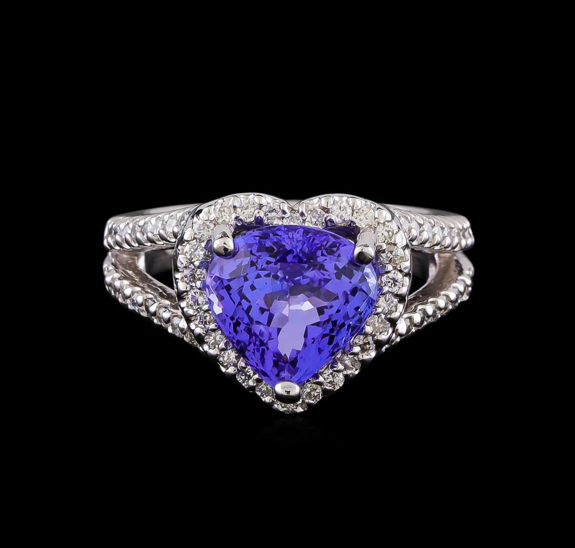 One electronically tested 14KT white gold lady's cast fashion ring with a split shank cathedral halo with a bright polish finish. The featured lady's has a heart shaped motif and a shank measuring 3.47 millimeters in width. Identified with markings of "14K". Condition is new, good workmanship. Containing: One prong set pear modified brilliant cut natural tanzanite, measuring 10.00 x 9.96 x 5.51mm, (depth est.) 5%. bulge factor, approximate weight of 4.10ct., clarity is eye clean, medium, moderately strong, bluish violet color, (GIA bV 5/4), cut is very good. Transmitting light with no distortion, transparent. Colored gemstones are presumed to have been subjected to commonly used enhancement processes. Graded in the setting. Twenty prong set round brilliant cut diamonds, measuring 1.20 - 1.15 x 0.74mm (depth est.) approximate total weight of 20 Stones = 0.13ct. Graded in the setting. Clarity: SI-1 to SI-2. Color: H - I. Cut Good Fifty-Eight prong set round brilliant cut diamonds, measuring 1.40 - 1.35 x 0.86mm (depth est.) approximate total weight of 58 Stones = 0.58ct. Graded in the setting. Clarity: SI-1 to I-1. Color: G - I. Cut Good. Total Weight of Colored Stones 4.10ct. Total Weight of Diamonds 0.71ct. Total Weight of Ring 9.10gm.