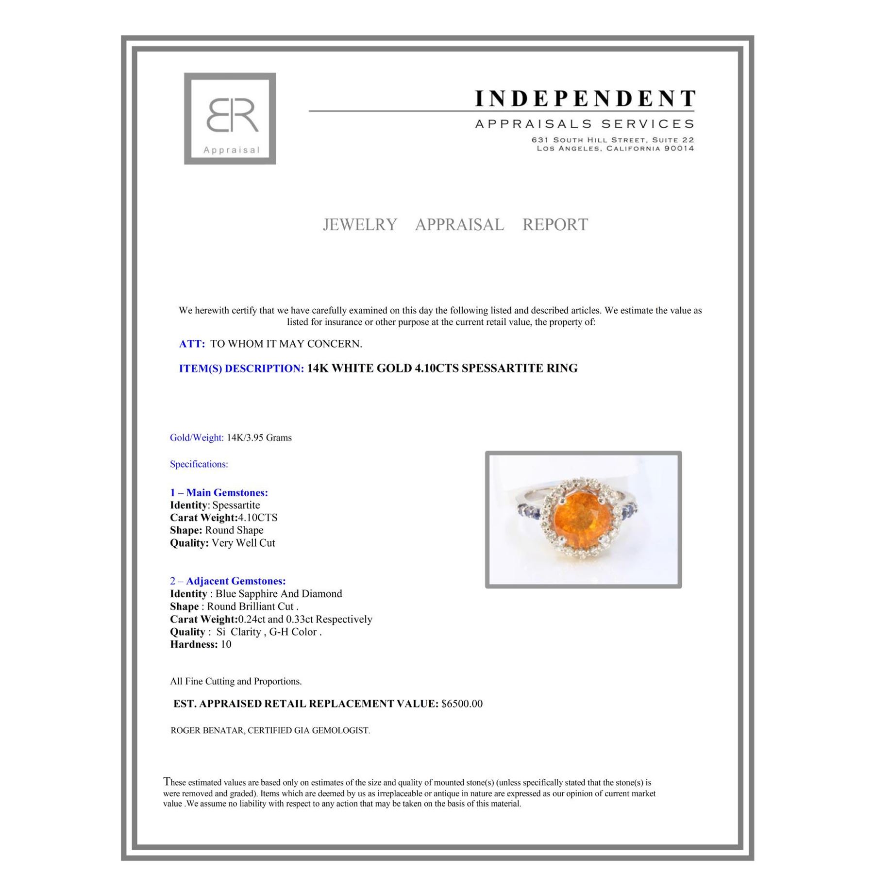14K WHITE GOLD NATURAL SPESSARTITE RING:3.945 GRAMS/DIAMOND:0.33CT/BLUE SAPPHIRE:0.24CT/SPESSARTITE:4.10CT/#GVR1051 **Known for its powerful energy of creativity, sexuality and attraction, this bright and beaming 4.10ct round shape Spessartite glimmers brilliantly like the sun. Encircled with rays of 0.33ct round brilliant cut Diamonds, and flanked with 0.24 round brilliant cut Blue Sapphires, this 14K white gold cocktail ring is an investment piece; it shines like a warm summer's day.**