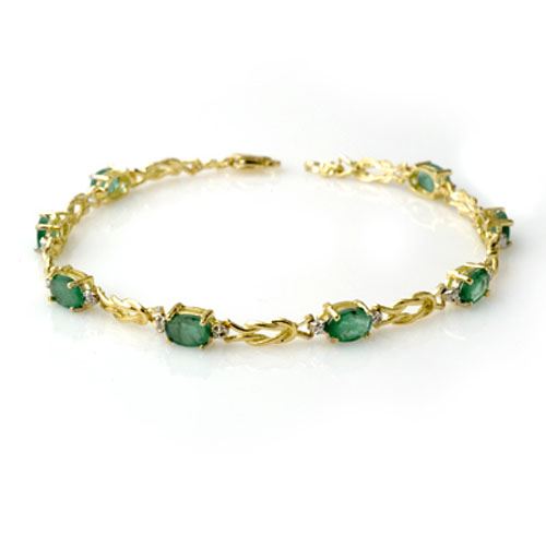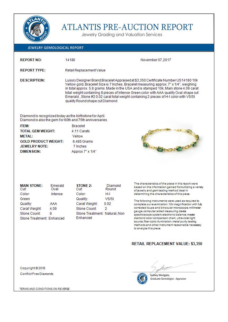 REF-50W9F -14180 ---- 4.11 CTW Emerald & Diamond Bracelet 10K Yellow Gold ---- Luxury Designer Brand Bracelet Appraised at $3,350 Certificate Number US14180 10k Yellow gold, Bracelet Size is 7 Inches, Bracelet measuring approx. 7" x 1/4", weighing in total approx. 5.8 grams. Made in the USA and is stamped 10k, Main stone 4.09 carat total weight containing 8 pieces of Intense Green color with AAA quality Oval shape cut Emerald , Stone #2 0.02 carat total weight containing 2 pieces of H-I color with VS/SI quality Round shape cut Diamond