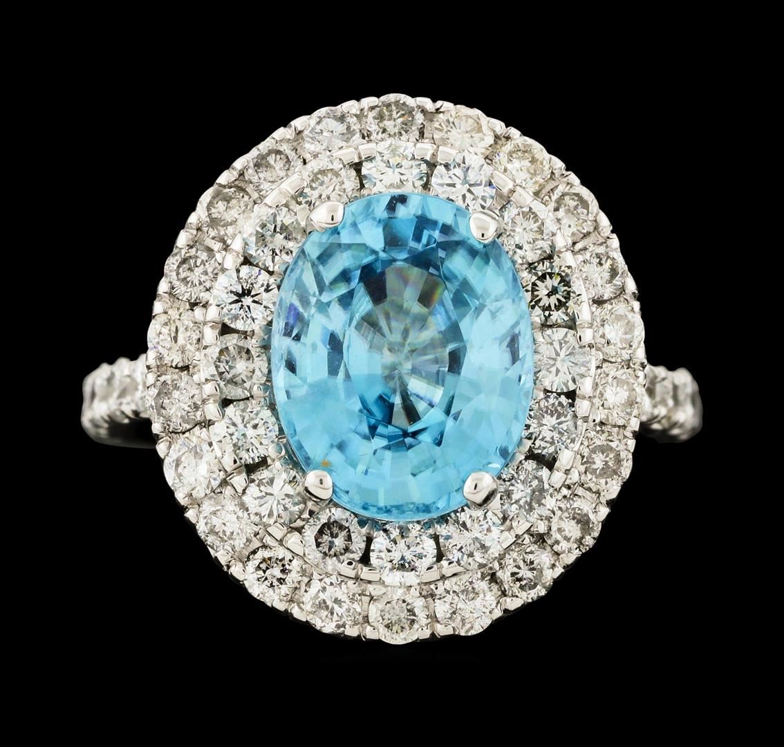 One electronically tested 14KT white gold lady's cast fashion ring with a cathedral double basket halo with a bright polish finish. The featured lady's ring has a shank measuring 2.04 millimeters wide. Identified with markings of '14K'. Condition is new, good workmanship. Containing: One prong set oval modified mixed cut natural blue zircon, measuring 10.09 x 8.03 x 5.10mm, (depth est.) approximate weight of 4.11ct., clarity is eye clean, medium, moderately strong, green blue color, (GIA GB 5/4), cut is very good. Transmitting light with no distortion, transparent. Colored gemstones are presumed to have been subjected to commonly used enhancement processes. Graded in the setting. Fifty-Six prong set round brilliant cut diamonds, measuring 2.05 - 1.95 x 1.24mm (depth est.) approximate total weight of 56 Stones = 1.71ct. Graded in the setting. Clarity SI-1 to SI-2. Color: H - I Cut Good. Total Weight of Colored Stones 4.11ct.. Total Weight of Diamonds 1.71ct.. Total Weight of Ring 5.20gm. GAS Appraised at $6,965.00.
