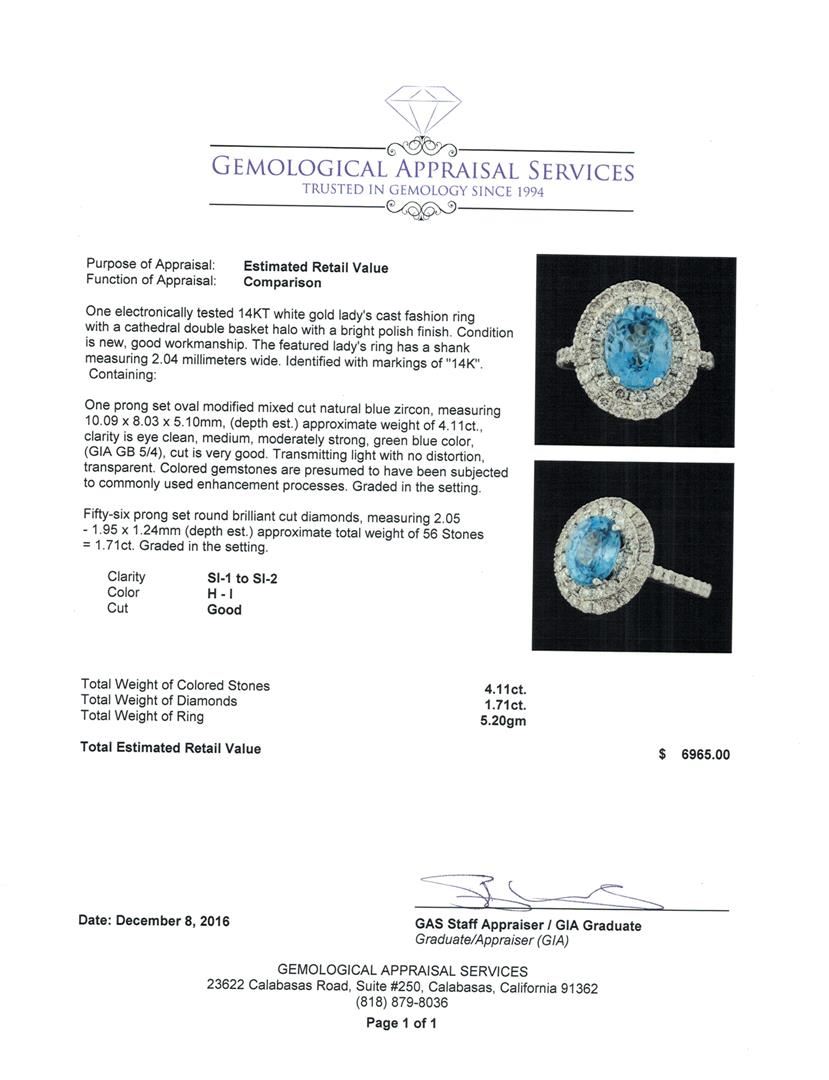 One electronically tested 14KT white gold lady's cast fashion ring with a cathedral double basket halo with a bright polish finish. The featured lady's ring has a shank measuring 2.04 millimeters wide. Identified with markings of '14K'. Condition is new, good workmanship. Containing: One prong set oval modified mixed cut natural blue zircon, measuring 10.09 x 8.03 x 5.10mm, (depth est.) approximate weight of 4.11ct., clarity is eye clean, medium, moderately strong, green blue color, (GIA GB 5/4), cut is very good. Transmitting light with no distortion, transparent. Colored gemstones are presumed to have been subjected to commonly used enhancement processes. Graded in the setting. Fifty-Six prong set round brilliant cut diamonds, measuring 2.05 - 1.95 x 1.24mm (depth est.) approximate total weight of 56 Stones = 1.71ct. Graded in the setting. Clarity SI-1 to SI-2. Color: H - I Cut Good. Total Weight of Colored Stones 4.11ct.. Total Weight of Diamonds 1.71ct.. Total Weight of Ring 5.20gm. GAS Appraised at $6,965.00.