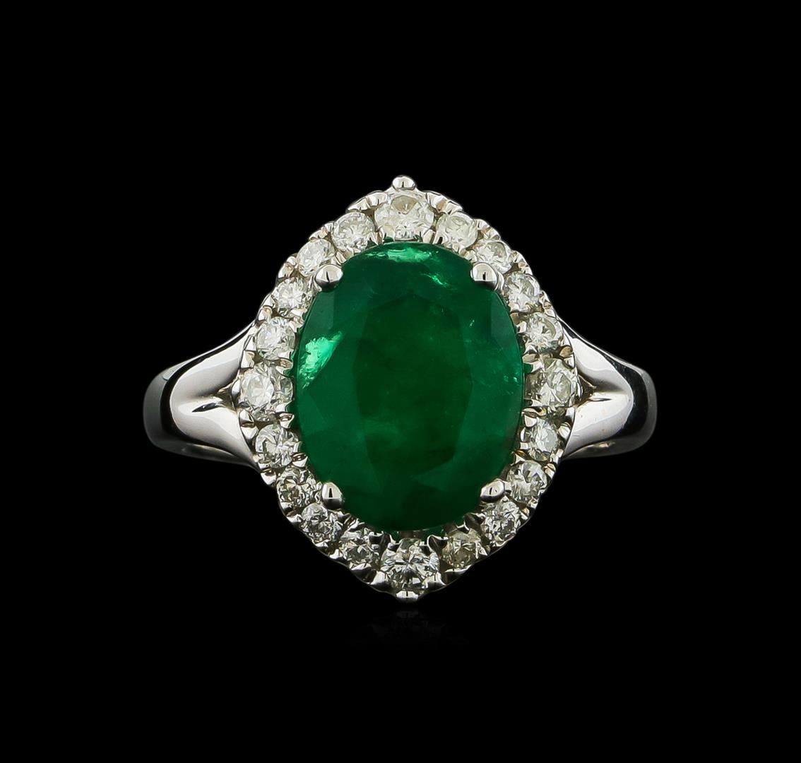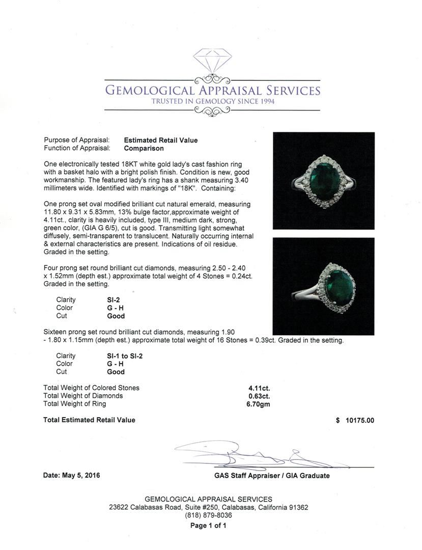 One electronically tested 18KT white gold lady's cast fashion ring with a basket halo with a bright polish finish. The featured lady's ring has a shank measuring 3.40 millimeters wide. Identified with markings of "18K". Condition is new, good workmanship. Containing: One prong set oval modified brilliant cut natural emerald, measuring 11.80 x 9.31 x 5.83mm, 13%. bulge factor, approximate weight of 4.11ct., clarity is heavily included, type III, medium dark, strong, green color, (GIA G 6/5), cut is good. Transmitting light somewhat diffusely, semi-transparent to translucent. Naturally occurring internal & external characteristics are present. Indications of oil residue. Graded in the setting. Four prong set round brilliant cut diamonds, measuring 2.50 - 2.40 x 1.52mm (depth est.) approximate total weight of 4 Stones = 0.24ct. Graded in the setting. Clarity: SI-2. Color: G - Good Sixteen prong set round brilliant cut diamonds, measuring 1.90 - 1.80 x 1.15mm (depth est.) approximate total weight of 16 Stones = 0.39ct. Graded in the setting. Clarity: SI-1 to SI-2. Color: G - Good. Total Weight of Colored Stones 4.11ct. Total Weight of Diamonds 0.63ct. Total Weight of Ring 6.70gm GAS Appraised at $10,175.00.