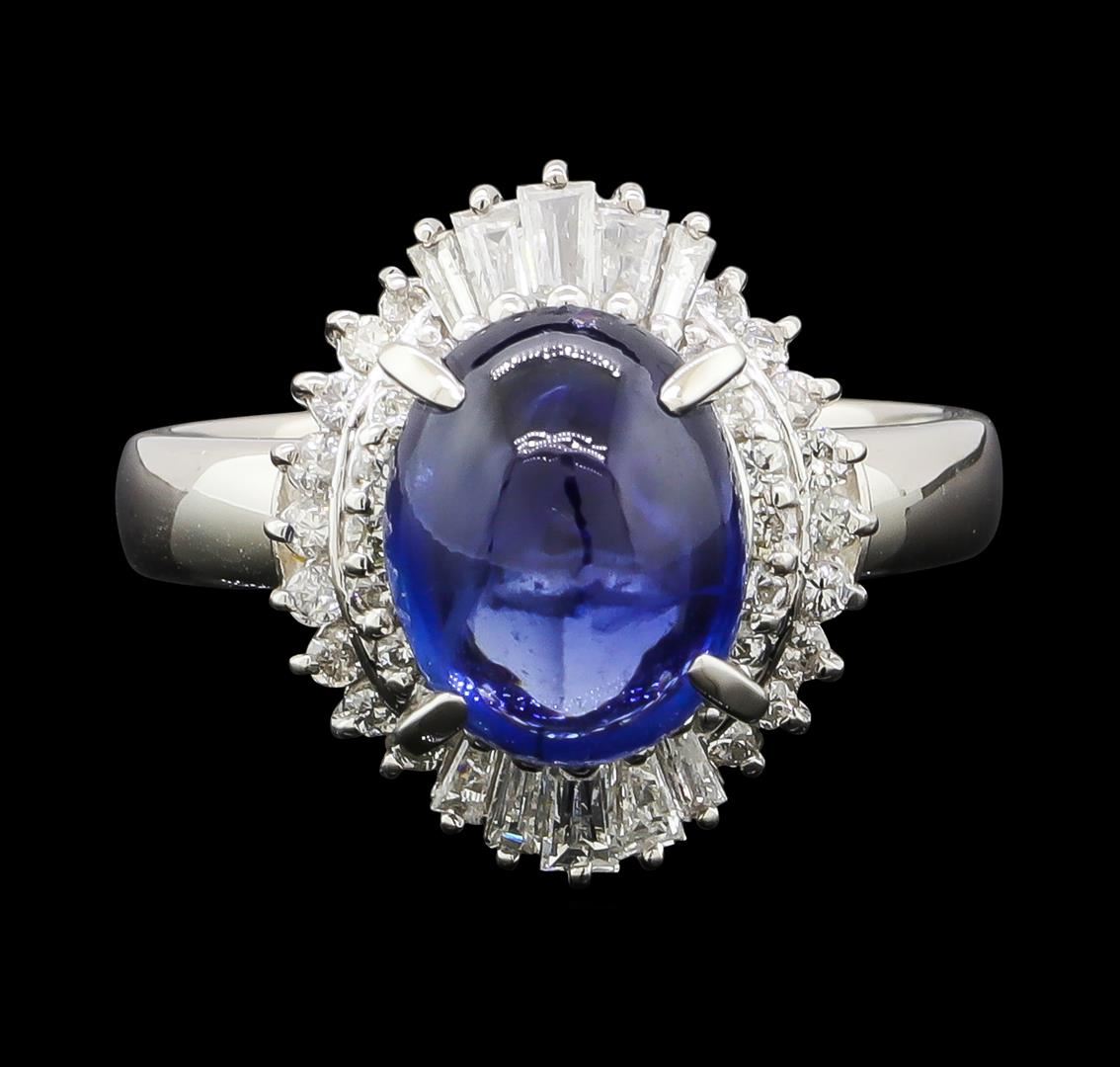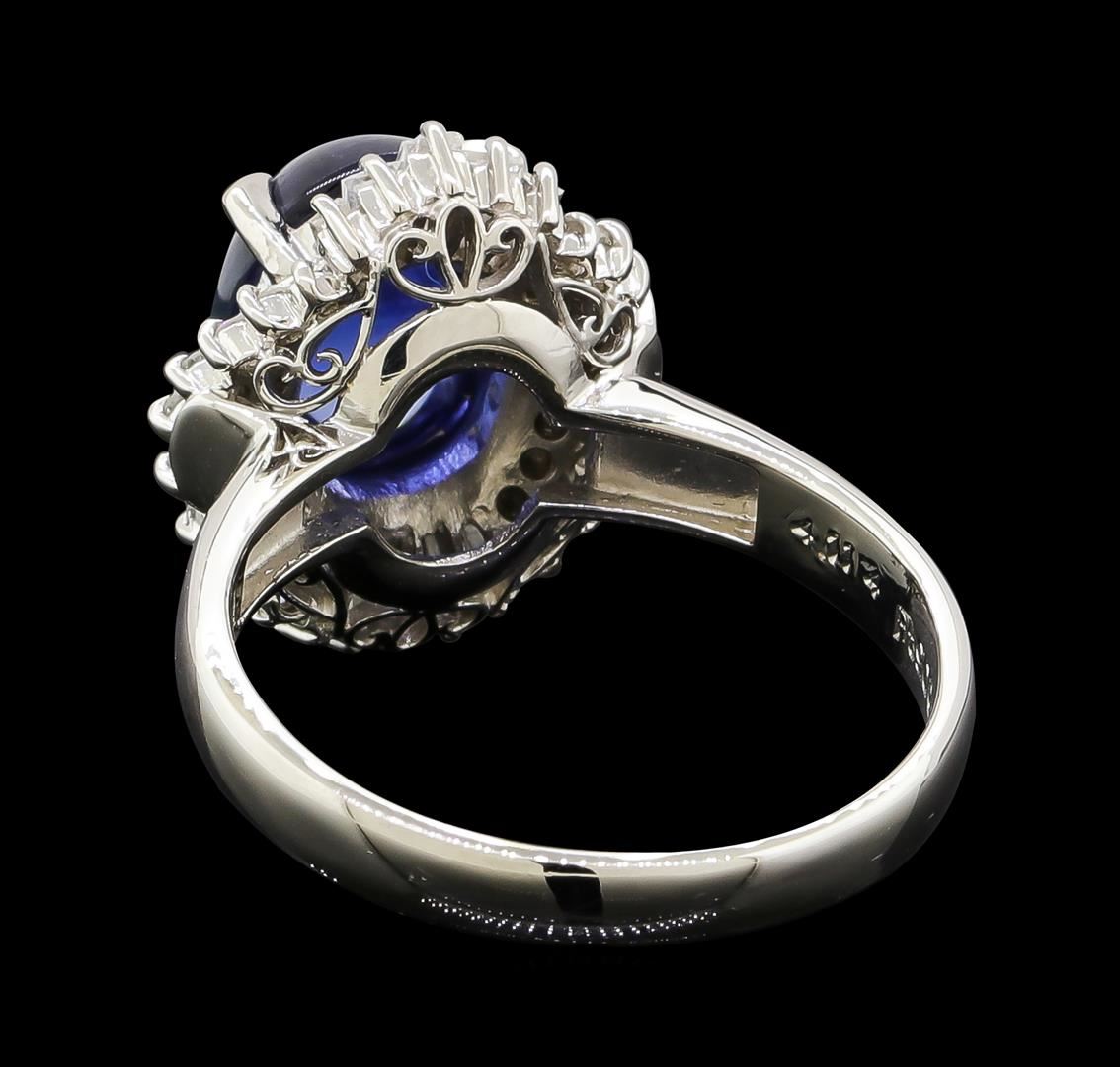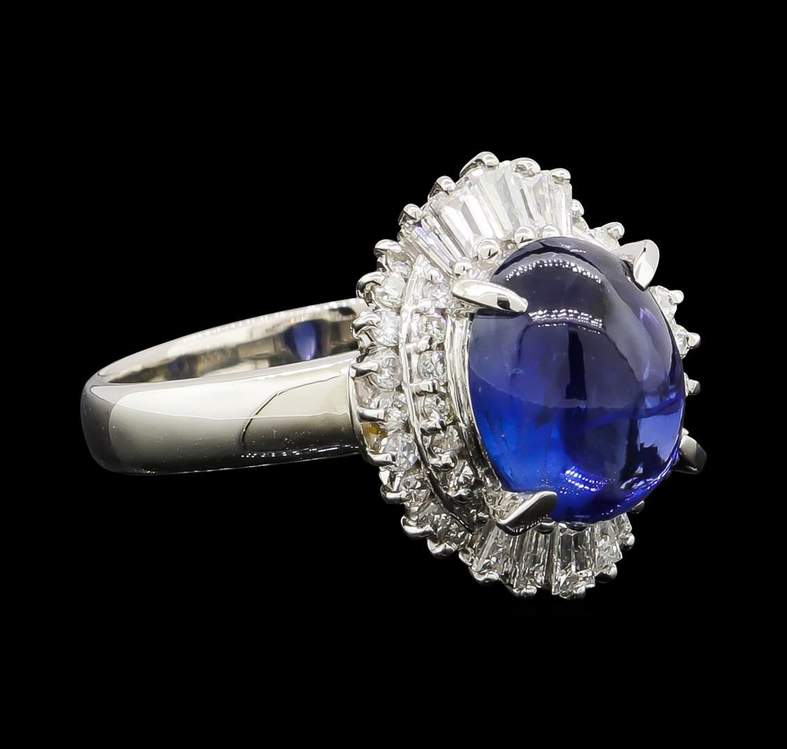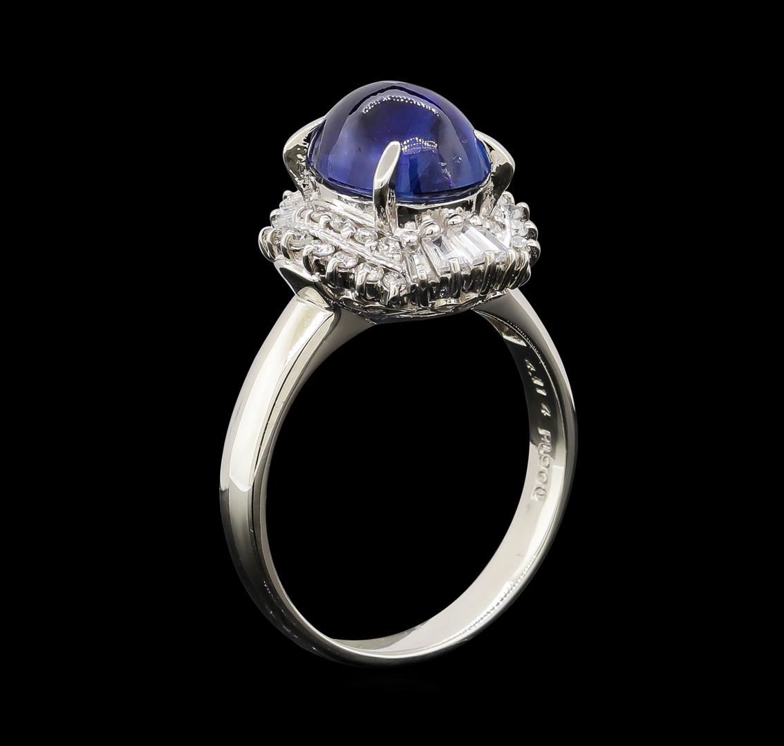 One ring featuring: Platinum containing Sapphire with a total weight of 4.11ct and Diamonds with a total weight of 0.50ct. Total Weight of Ring: 8.2 grams.
