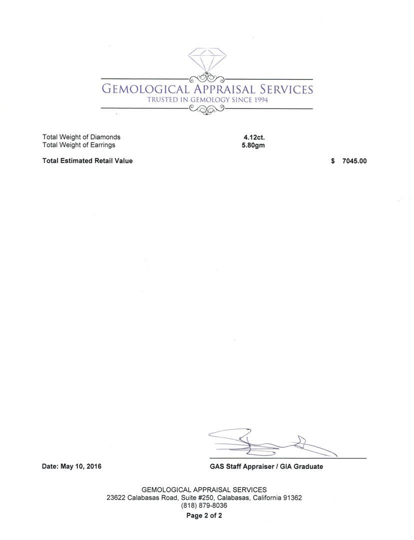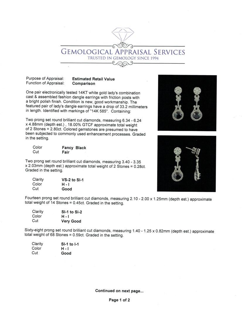 One pair electronically tested 14KT white gold lady's combination cast & assembled fashion dangle earrings with friction posts with a bright polish finish. The featured pair of lady's dangle earrings have a drop of 33.2 millimeters in length. Identified with markings of "14K 585". Condition is new, good workmanship. Containing: Two prong set round brilliant cut diamonds, measuring 6.34 - 6.24 x 4.88mm (depth est.) , 18.00.%. GTCF approximate total weight of 2 Stones = 2.80ct. Colored gemstones are presumed to have been subjected to commonly used enhancement processes. Graded in the setting. Cut Fair Two prong set round brilliant cut diamonds, measuring 3.40 - 3.35 x 2.03mm (depth est.) approximate total weight of 2 Stones = 0.28ct. Graded in the setting. Clarity: VS-2 to SI-1. Color: H - I. Cut Good Fourteen prong set round brilliant cut diamonds, measuring 2.10 - 2.00 x 1.25mm (depth est.) approximate total weight of 14 Stones = 0.45ct. Graded in the setting. Clarity: SI-1 to SI-2. Color: H - I. Cut Very Good Sixty-Eight prong set round brilliant cut diamonds, measuring 1.40 - 1.25 x 0.82mm (depth est.) approximate total weight of 68 Stones = 0.59ct. Graded in the setting. Clarity: SI-1 to I-1. Color: H - I. Cut Good. Total Weight of Diamonds 4.12ct. Total Weight of Earrings 5.80gm. GAS Appraised at $7,045.00.
