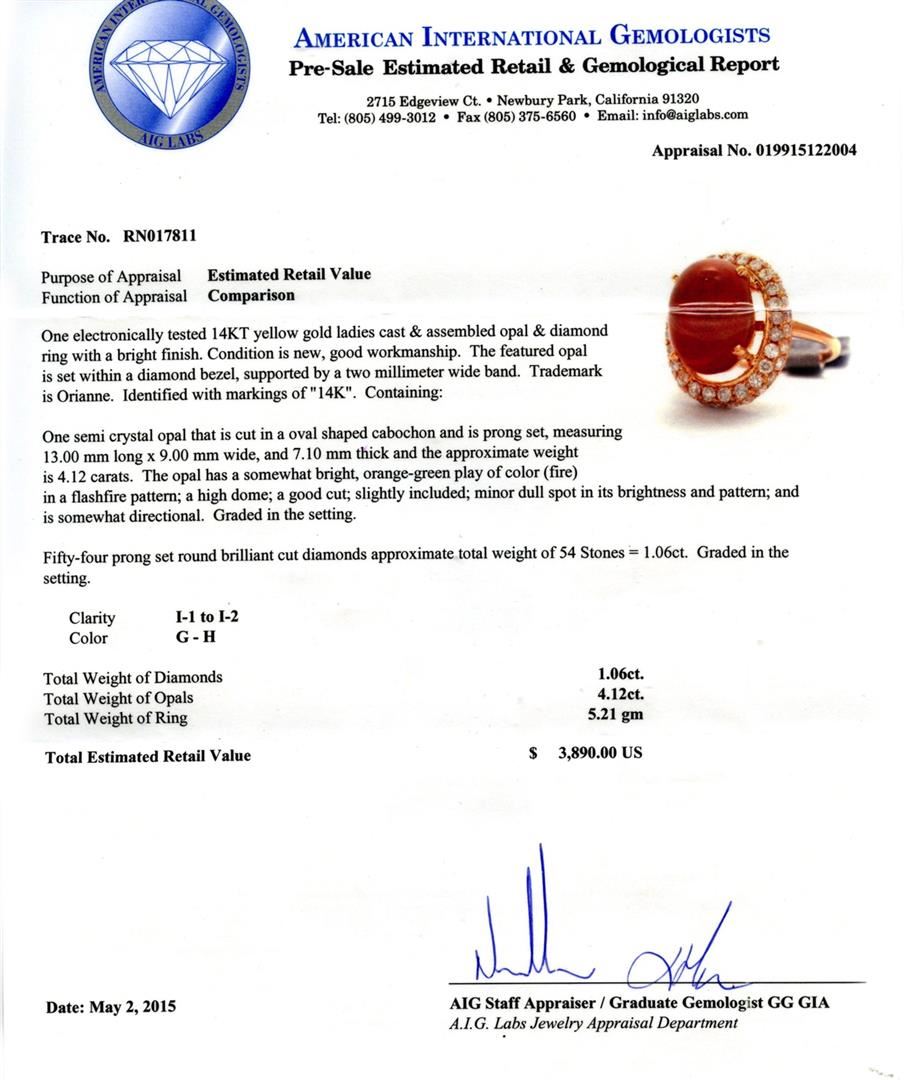 4.12ct Opal and 1.06ctw Diamond 14K Yellow Gold Ring. Please see Photos and Description for all available information. This elegant diamond ring on a 14K yellow gold band is a dainty piece made to perfection. The 4.12ct opal and 1.06ctw diamond, the opal and diamond combination is the perfect match of fire, elegance, and radiance. Ring Size 6 3/4