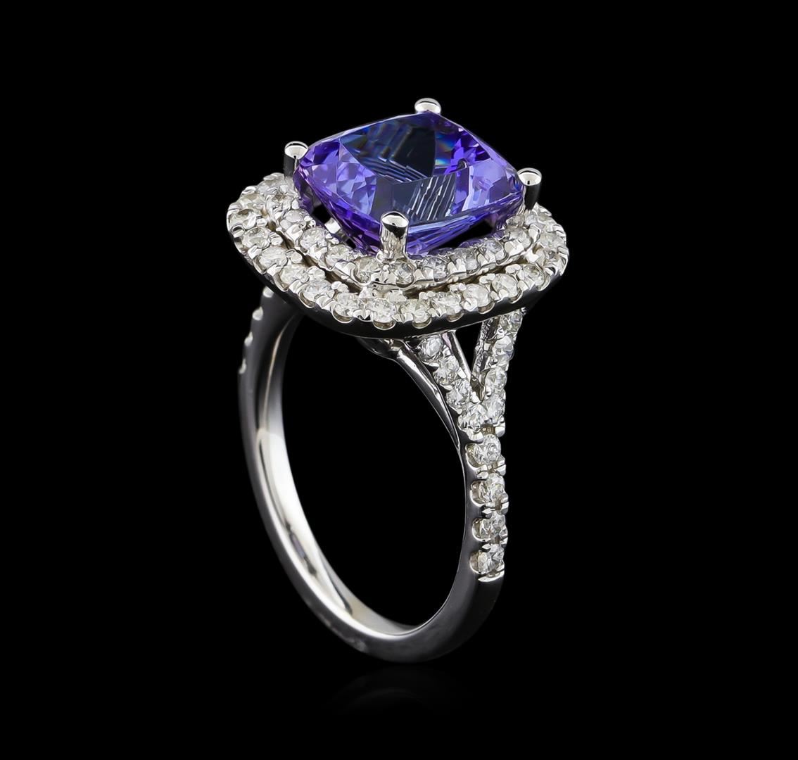 One electronically tested 14KT white gold lady's cast fashion ring with a split shank double halo with a bright polish finish. The featured lady's ring has a shank measuring 1.71 millimeters wide. Identified with markings of "14K". Condition is new, good workmanship. Containing: One prong set rectangular cushion modified brilliant cut natural tanzanite, measuring 9.49 x 8.84 x 6.43mm, approximate weight of 4.12ct., clarity is eye clean, type I, medium, very slightly grayish, bluish violet color, (GIA bV 5/3), cut is good. Transmitting light with no distortion, transparent. Colored gemstones are presumed to have been subjected to commonly used enhancement processes. Graded in the setting. Seventy prong set round brilliant cut diamonds, measuring 1.60 - 1.35 x 0.92mm (depth est.) approximate total weight of 70 Stones = 0.87ct. Graded in the setting. Clarity: SI-1 to I-1. Color: G - Good. Total Weight of Colored Stones 4.12ct. Total Weight of Diamonds 0.87ct. Total Weight of Ring 6.00gm. GAS Appraised at $6,545.00.