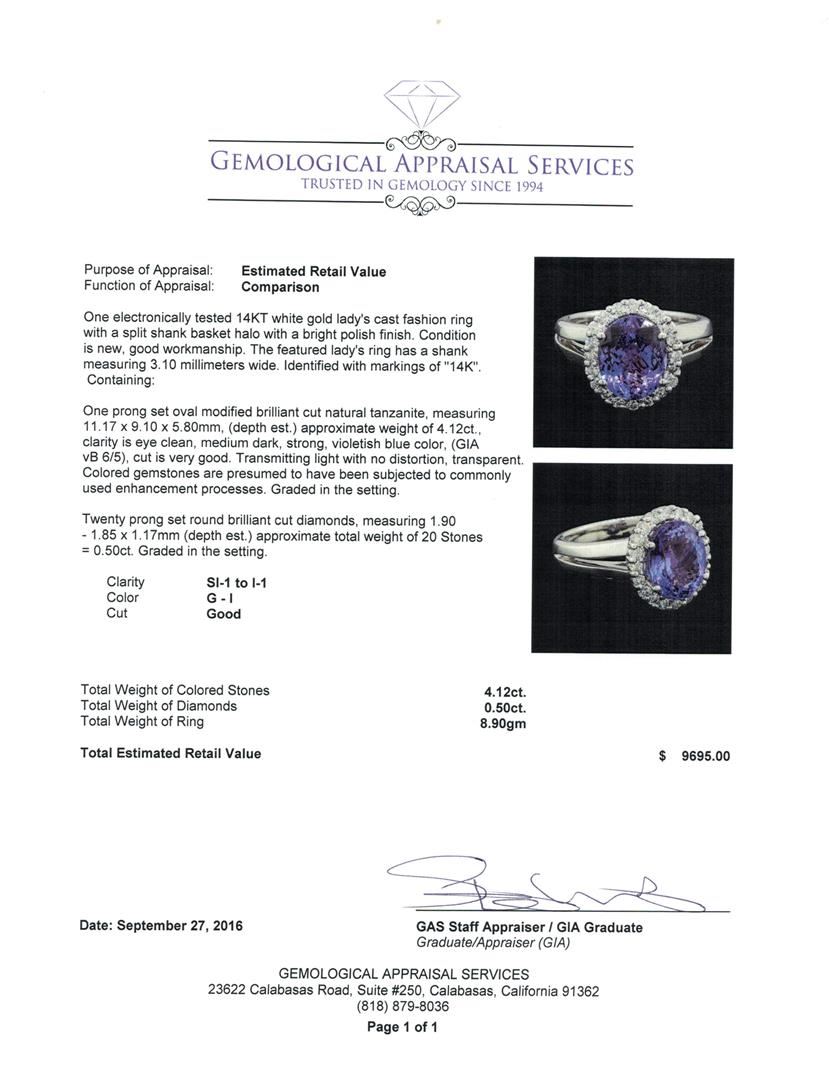 One electronically tested 14KT white gold lady's cast fashion ring with a split shank basket halo with a bright polish finish. The featured lady's ring has a shank measuring 3.10 millimeters wide. Identified with markings of '14K'. Condition is new, good workmanship. Containing: One prong set oval modified brilliant cut natural tanzanite, measuring 11.17 x 9.10 x 5.80mm, (depth est.) approximate weight of 4.12ct., clarity is eye clean, medium dark, strong, violetish blue color, (GIA vB 6/5), cut is very good. Transmitting light with no distortion, transparent. Colored gemstones are presumed to have been subjected to commonly used enhancement processes. Graded in the setting. Twenty prong set round brilliant cut diamonds, measuring 1.90 - 1.85 x 1.17mm (depth est.) approximate total weight of 20 Stones = 0.50ct. Graded in the setting. Clarity SI-1 to I-1. Color: G - I Cut Good. Total Weight of Colored Stones 4.12ct.. Total Weight of Diamonds 0.50ct.. Total Weight of Ring 8.90gm. GAS Appraised at $9,695.00.