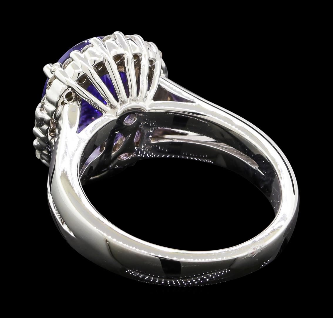 One electronically tested 14KT white gold lady's cast fashion ring with a split shank basket halo with a bright polish finish. The featured lady's ring has a shank measuring 3.10 millimeters wide. Identified with markings of '14K'. Condition is new, good workmanship. Containing: One prong set oval modified brilliant cut natural tanzanite, measuring 11.17 x 9.10 x 5.80mm, (depth est.) approximate weight of 4.12ct., clarity is eye clean, medium dark, strong, violetish blue color, (GIA vB 6/5), cut is very good. Transmitting light with no distortion, transparent. Colored gemstones are presumed to have been subjected to commonly used enhancement processes. Graded in the setting. Twenty prong set round brilliant cut diamonds, measuring 1.90 - 1.85 x 1.17mm (depth est.) approximate total weight of 20 Stones = 0.50ct. Graded in the setting. Clarity SI-1 to I-1. Color: G - I Cut Good. Total Weight of Colored Stones 4.12ct.. Total Weight of Diamonds 0.50ct.. Total Weight of Ring 8.90gm. GAS Appraised at $9,695.00.