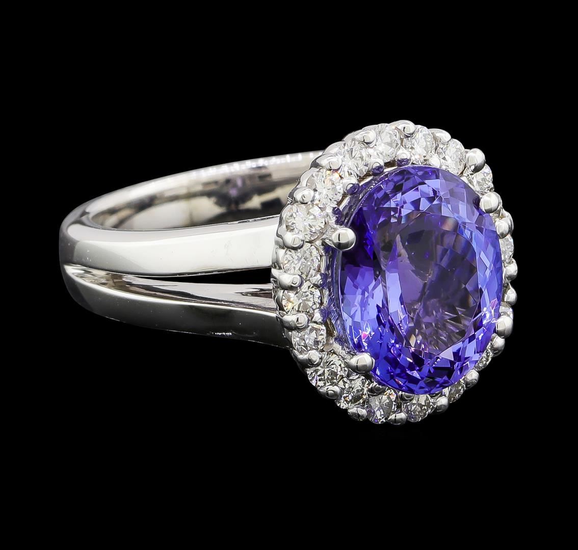 One electronically tested 14KT white gold lady's cast fashion ring with a split shank basket halo with a bright polish finish. The featured lady's ring has a shank measuring 3.10 millimeters wide. Identified with markings of '14K'. Condition is new, good workmanship. Containing: One prong set oval modified brilliant cut natural tanzanite, measuring 11.17 x 9.10 x 5.80mm, (depth est.) approximate weight of 4.12ct., clarity is eye clean, medium dark, strong, violetish blue color, (GIA vB 6/5), cut is very good. Transmitting light with no distortion, transparent. Colored gemstones are presumed to have been subjected to commonly used enhancement processes. Graded in the setting. Twenty prong set round brilliant cut diamonds, measuring 1.90 - 1.85 x 1.17mm (depth est.) approximate total weight of 20 Stones = 0.50ct. Graded in the setting. Clarity SI-1 to I-1. Color: G - I Cut Good. Total Weight of Colored Stones 4.12ct.. Total Weight of Diamonds 0.50ct.. Total Weight of Ring 8.90gm. GAS Appraised at $9,695.00.