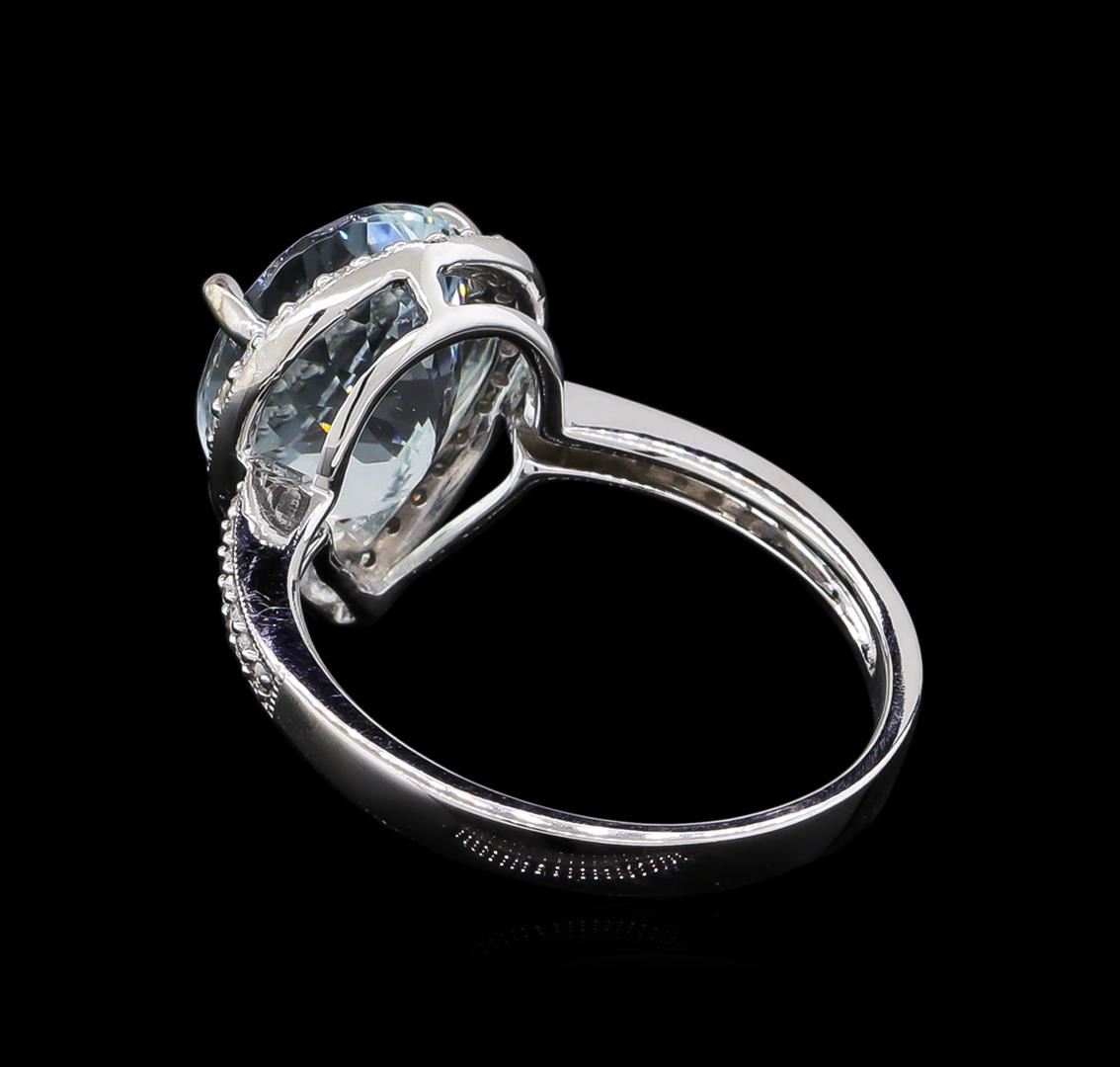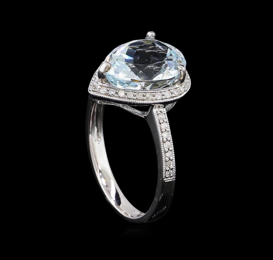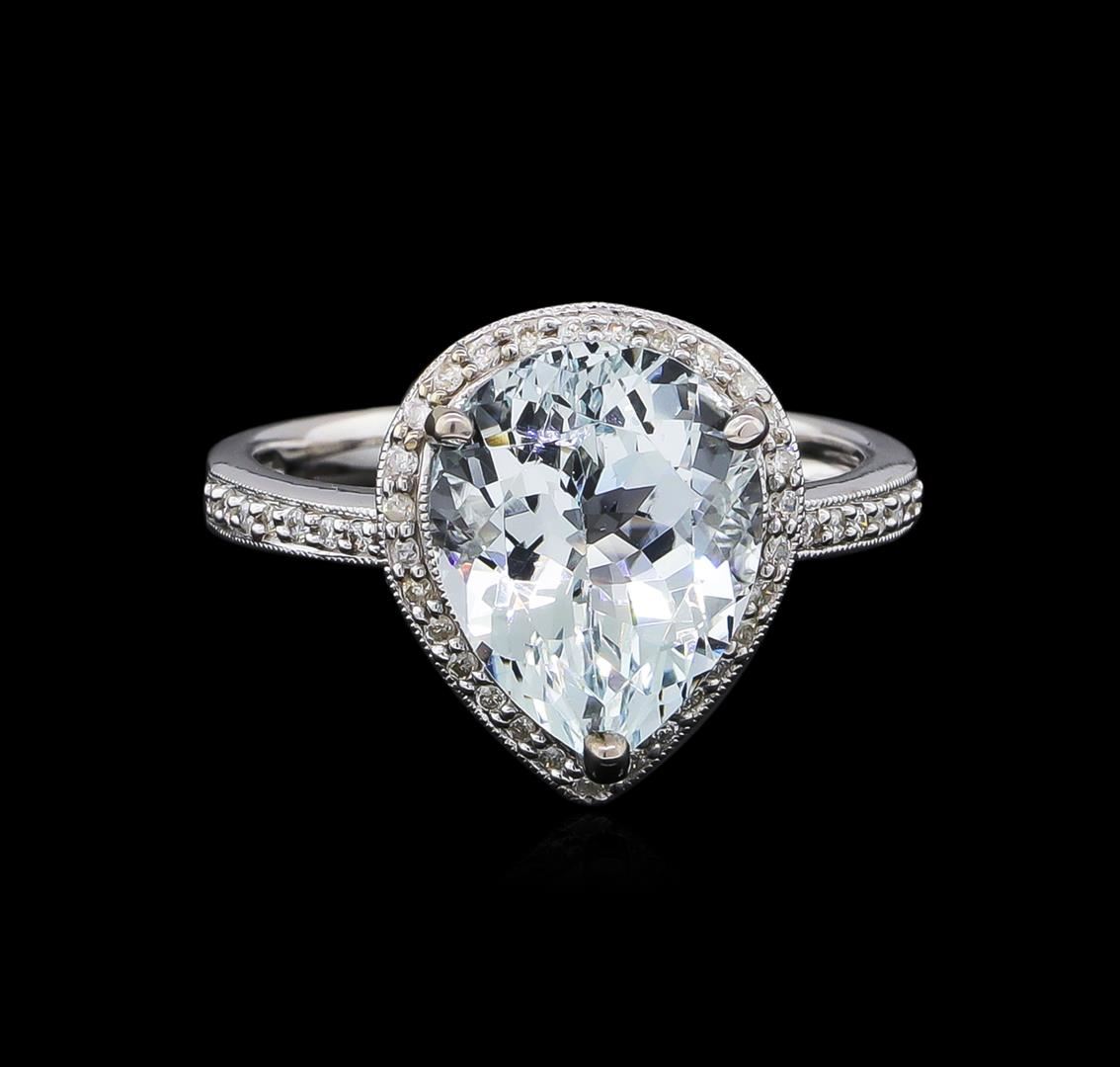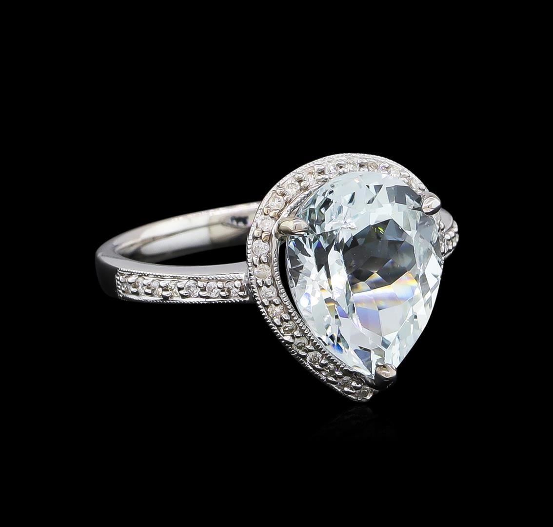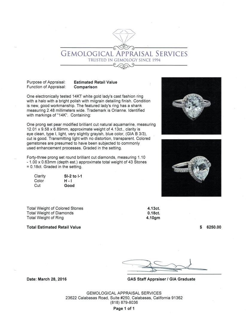 One electronically tested 14KT white gold lady's cast fashion ring with a halo with a bright polish with milgrain detailing finish. The featured lady's ring has a shank measuring 2.48 millimeters wide. Trademark is Orianne. Identified with markings of "14K". Condition is new, good workmanship. Containing: One prong set pear modified brilliant cut natural aquamarine, measuring 12.01 x 9.58 x 6.89mm, approximate weight of 4.13ct., clarity is eye clean, type I, light, very slightly grayish, blue color, (GIA B 3/3), cut is good. Transmitting light with no distortion, transparent. Colored gemstones are presumed to have been subjected to commonly used enhancement processes. Graded in the setting. Forty-Three prong set round brilliant cut diamonds, measuring 1.10 - 1.00 x 0.63mm (depth est.) approximate total weight of 43 Stones = 0.18ct. Graded in the setting. Clarity: SI-2 to I-1. Color: H - I. Cut Good. Total Weight of Colored Stones 4.13ct. Total Weight of Diamonds 0.18ct. Total Weight of Ring 4.10gm. GAS Appraised at $6,250.00.