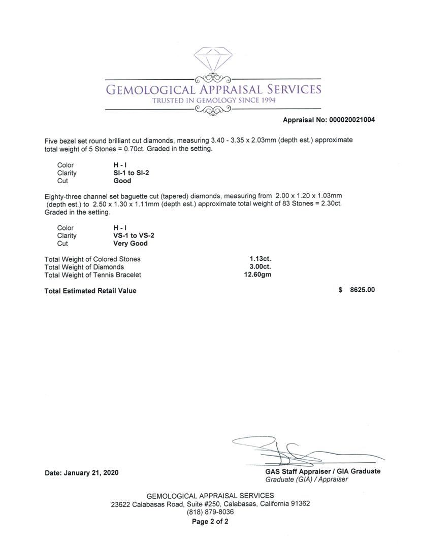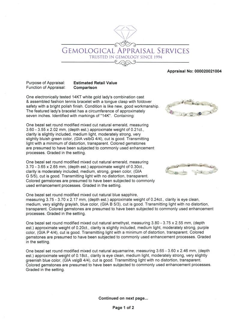 One electronically tested 14KT white gold lady's combination cast & assembled fashion tennis bracelet with a tongue clasp with foldover safety with a bright polish finish. The featured lady's bracelet has a circumference of approximately seven inches. Ide GAS Appraised at $8,625.00.