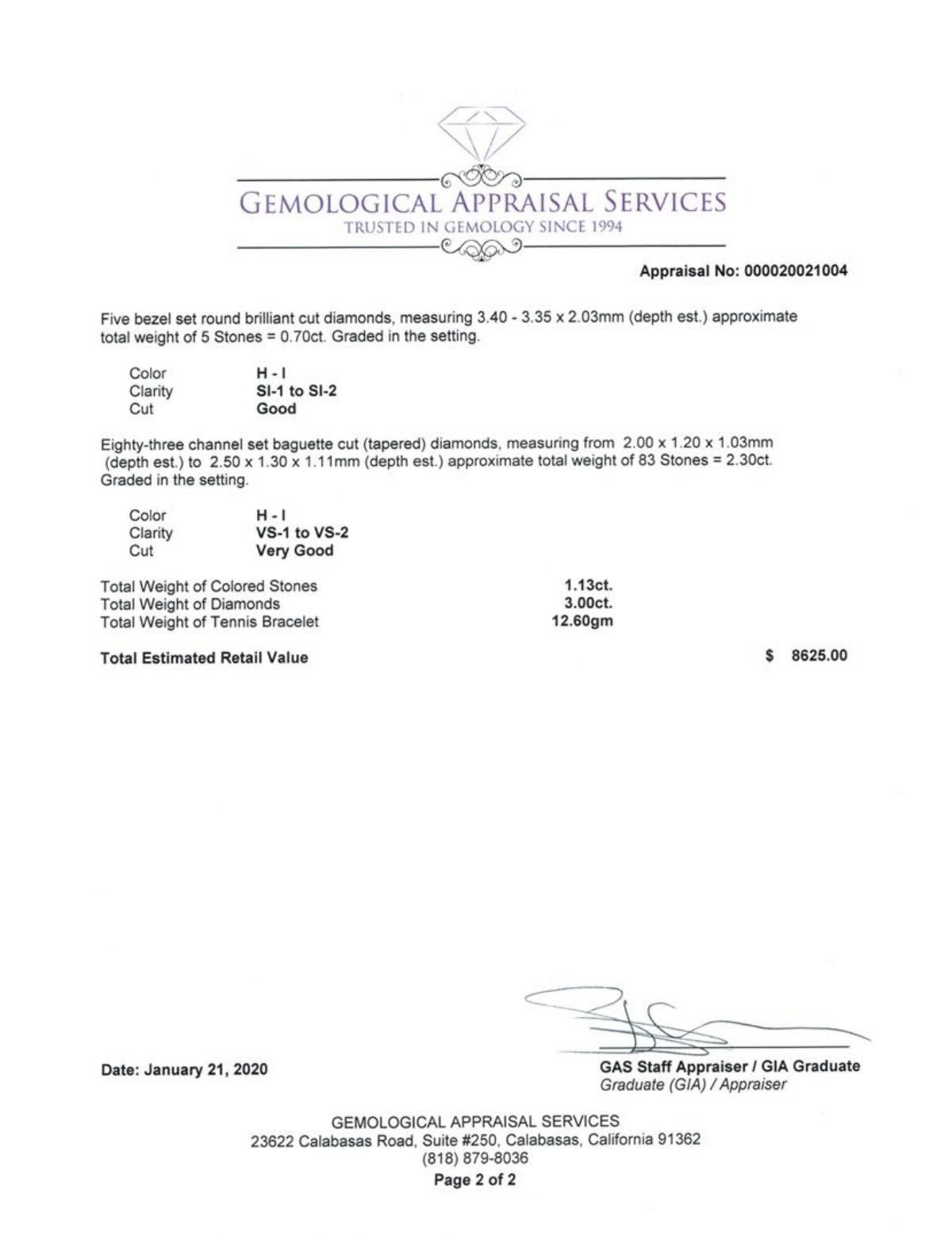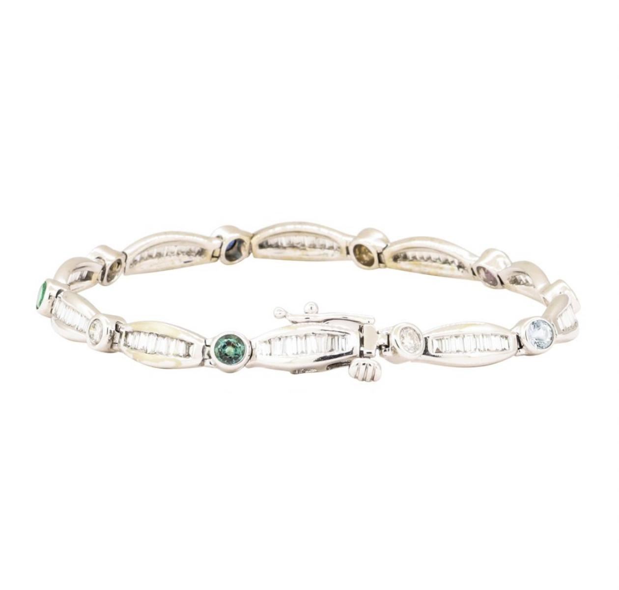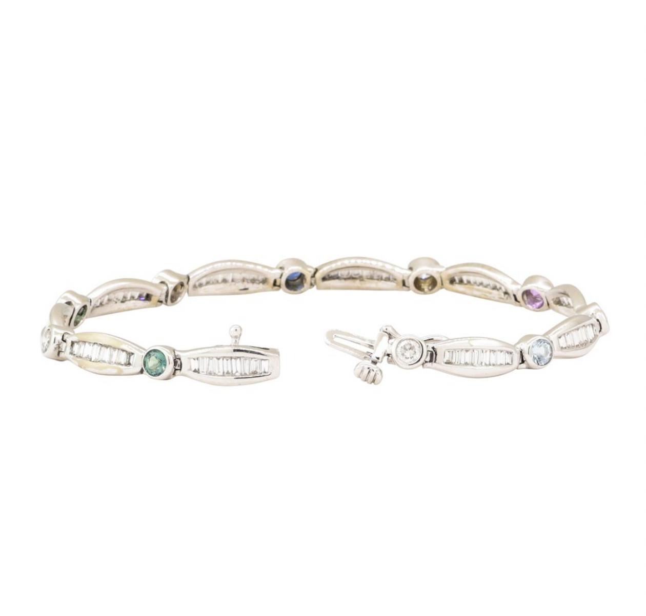 One electronically tested 14KT white gold lady's combination cast & assembled fashion tennis bracelet with a tongue clasp with foldover safety with a bright polish finish. The featured lady's bracelet has a circumference of approximately seven inches. Identified with markings of '14K'. Condition is like new, good workmanship. Containing: One bezel set round modified mixed cut natural emerald, measuring 3.60 - 3.55 x 2.02 mm, (depth est.) approximate weight of 0.21ct., clarity is slightly included, medium light, moderately strong, very slightly bluish green color, (GIA vslbG 4/4), cut is good. Transmitting light with a minimum of distortion, transparent. Colored gemstones are presumed to have been subjected to commonly used enhancement processes. Graded in the setting. One bezel set round modified mixed cut natural emerald, measuring 3.70 - 3.65 x 2.65 mm, (depth est.) approximate weight of 0.30ct., clarity is moderately included, medium, strong, green color, (GIA G 5/5), cut is good. Transmitting light with no distortion, transparent. Colored gemstones are presumed to have been subjected to commonly used enhancement processes. Graded in the setting. One bezel set round modified mixed cut natural blue sapphire, measuring 3.75 - 3.70 x 2.17 mm, (depth est.) approximate weight of 0.24ct., clarity is eye clean, medium, very slightly grayish, blue color, (GIA B 5/3), cut is good. Transmitting light with no distortion, transparent. Colored gemstones are presumed to have been subjected to commonly used enhancement processes. Graded in the setting. One bezel set round modified mixed cut natural amethyst, measuring 3.80 - 3.75 x 2.55 mm, (depth est.) approximate weight of 0.20ct., clarity is slightly included, medium light, moderately strong, purple color, (GIA P 4/4), cut is good. Transmitting light with a minimum of distortion, transparent. Colored gemstones are presumed to have been subjected to commonly used enhancement processes. Graded in the setting. One bezel set round modified mixed cut natural aquamarine, measuring 3.65 - 3.60 x 2.46 mm, (depth est.) approximate weight of 0.18ct., clarity is eye clean, medium light, moderately strong, very slightly greenish blue color, (GIA vslgB 4/4), cut is good. Transmitting light with no distortion, transparent. Colored gemstones are presumed to have been subjected to commonly used enhancement processes. Graded in the setting. Five bezel set round brilliant cut diamonds, measuring 3.40 - 3.35 x 2.03mm (depth est.) approximate total weight of 5 Stones = 0.70ct. Graded in the setting. Color H - I Clarity SI-1 to SI-2 Cut Good Eighty-Three channel set baguette cut (tapered) diamonds, measuring from 2.00 x 1.20 x 1.03mm (depth est.) to 2.50 x 1.30 x 1.11mm (depth est.) approximate total weight of 83 Stones = 2.30ct. Graded in the setting. Color H - I Clarity VS-1 to VS-2 Cut Very Good. Total Weight of Colored Stones 1.13ct.. Total Weight of Diamonds 3.00ct.. Total Weight of Tennis Bracelet 12.60gm GAS Appraised at $8625.00. GAS Appraised.