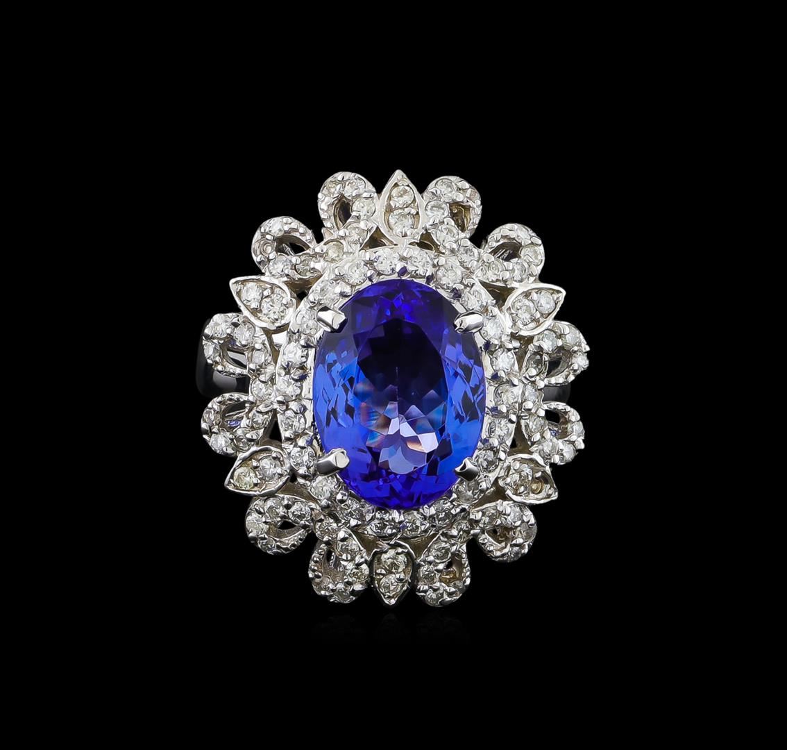 One electronically tested 14KT white gold lady's cast fashion ring with a scalloped basket halo with a bright polish finish. The featured lady's ring has a shank measuring 3.72 millimeters wide. Identified with markings of "K14". Condition is new, good workmanship. Containing: One prong set oval modified brilliant cut natural tanzanite, measuring 11.81 x 8.87 x 5.11mm, 10%. bulge factor, approximate weight of 4.13ct., clarity is eye clean, type I, medium, very slightly grayish, violetish blue color, (GIA vB 5/3), cut is very good. Transmitting light with no distortion, transparent. Colored gemstones are presumed to have been subjected to commonly used enhancement processes. Graded in the setting. Seventy-Six prong set round brilliant cut diamonds, measuring 1.35 - 1.25 x 0.81mm (depth est.) approximate total weight of 76 Stones = 0.65ct. Graded in the setting. Clarity: SI-1 to I-1. Color: G - Good Twelve prong set round brilliant cut diamonds, measuring 1.15 - 1.05 x 0.68mm (depth est.) approximate total weight of 12 Stones = 0.06ct. Graded in the setting. Clarity: SI-1 to I-1. Color: H - I. Cut Good. Total Weight of Colored Stones 4.13ct. Total Weight of Diamonds 0.71ct. Total Weight of Ring 7.80gm GAS Appraised at $9,745.00.
