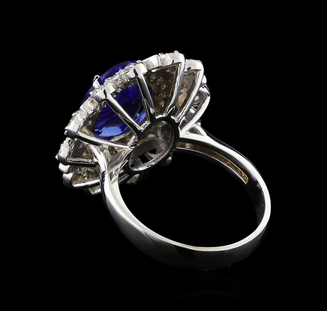 One electronically tested 14KT white gold lady's cast fashion ring with a scalloped basket halo with a bright polish finish. The featured lady's ring has a shank measuring 3.72 millimeters wide. Identified with markings of "K14". Condition is new, good workmanship. Containing: One prong set oval modified brilliant cut natural tanzanite, measuring 11.81 x 8.87 x 5.11mm, 10%. bulge factor, approximate weight of 4.13ct., clarity is eye clean, type I, medium, very slightly grayish, violetish blue color, (GIA vB 5/3), cut is very good. Transmitting light with no distortion, transparent. Colored gemstones are presumed to have been subjected to commonly used enhancement processes. Graded in the setting. Seventy-Six prong set round brilliant cut diamonds, measuring 1.35 - 1.25 x 0.81mm (depth est.) approximate total weight of 76 Stones = 0.65ct. Graded in the setting. Clarity: SI-1 to I-1. Color: G - Good Twelve prong set round brilliant cut diamonds, measuring 1.15 - 1.05 x 0.68mm (depth est.) approximate total weight of 12 Stones = 0.06ct. Graded in the setting. Clarity: SI-1 to I-1. Color: H - I. Cut Good. Total Weight of Colored Stones 4.13ct. Total Weight of Diamonds 0.71ct. Total Weight of Ring 7.80gm GAS Appraised at $9,745.00.