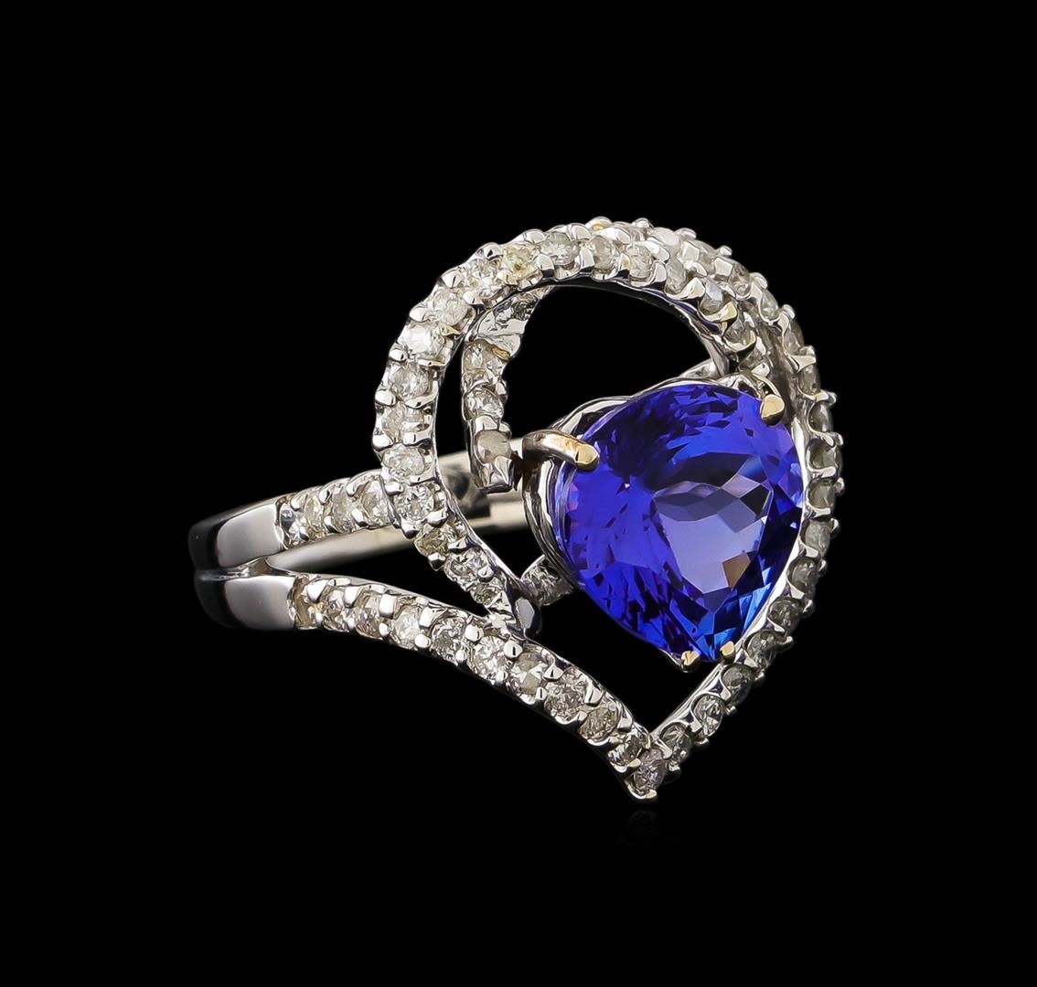 One electronically tested 18KT white gold ladies cast tanzanite and diamond ring with a bright polish finish. The featured tanzanite is set within intertwining diamond ribbons forming a stylized heart design supported by diamond set split shoulders, completed by a grooved two and one-half millimeter wide band. Identified with markings of "18K". Condition is new, good workmanship. Containing: One prong set pear mixed cut natural tanzanite, measuring 9.70 x 10.00 x 6.00mm, 6%. bulge factor, approximate weight of 4.13ct., clarity is eye clean, type I, medium dark, very slightly grayish, violetish blue color, (GIA vB 6/3), cut is good. Transmitting light with no distortion, transparent. Graded in the setting. Tanzanite is a very rare gemstone that is only found in the country of Tanzania. Originally discovered in 1967. Tiffany & Company, named the stone Tanzanite. It is found in the Usumburu Mountains that border the Umba Valley of northern Tanzania. Tanzanite occurs in gray, brown, violet, blue, reddish-purple, & green. The gem is interesting because of its exceptional pleochroism. Rotated in different directions a tanzanite will exhibit multiple changes of color. Tanzanite has a low tolerance to ultrasonic cleaning, and should not be cleaned using this method. Sixty-Three prong set round brilliant cut diamonds, measuring 1.60 - 1.50 x 0.93mm (depth est.) approximate total weight of 63 Stones = 0.88ct. Graded in the setting. Clarity: I-2 to I-3. Color: H - J. Total Weight of Colored Stones 4.13ct. Total Weight of Diamonds 0.88ct. Total Weight of Ring 6.89gm. AIG Appraised at $12,090.00.