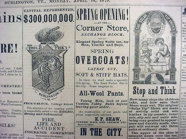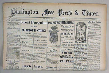 4-14-1879 BURLINGTON FREE PRESS AND TIMES NEWSPAPER - Incl. Deadwood - Indian scalping, The Negro Exodus, The Noble Redman, more.