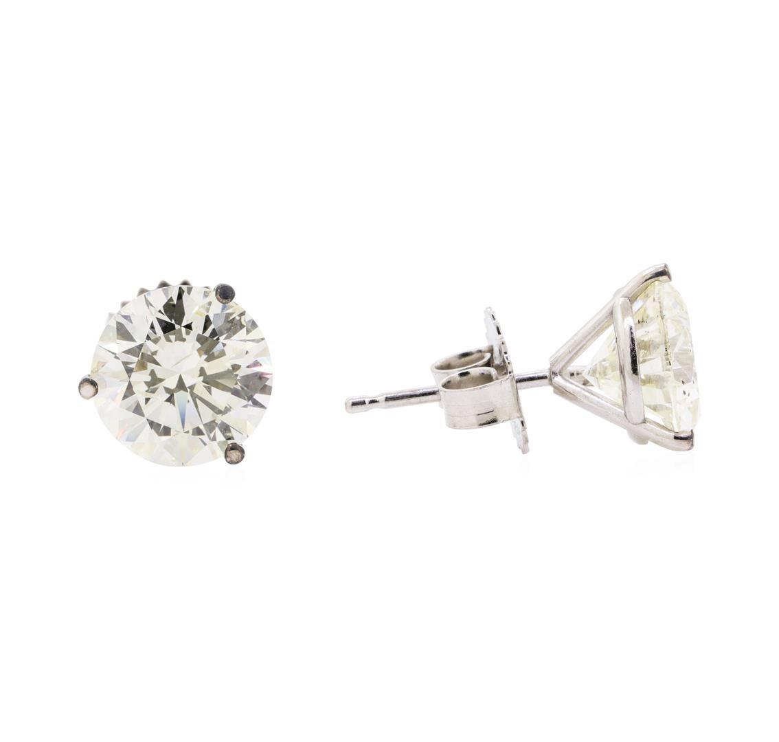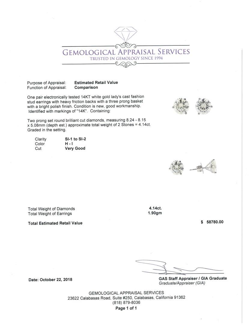 One pair electronically tested 14KT white gold lady's cast fashion stud earrings with heavy friction backs with a three prong basket with a bright polish finish. Identified with markings of '14K'. Condition is new, good workmanship. Containing: Two prong set round brilliant cut diamonds, measuring 8.24 - 8.15 x 5.08mm (depth est.) approximate total weight of 2 Stones = 4.14ct. Graded in the setting. Color H - I Clarity SI-1 to SI-2 Cut Very Good. Total Weight of Diamonds 4.14ct.. Total Weight of Earrings 1.90gm GAS Appraised at $58780.00. GAS Appraised at $58,780.00.