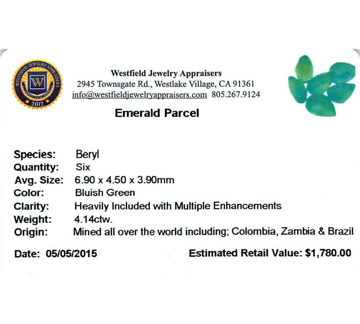 Six pear mixed cut natural emeralds, measuring 6.90 x 4.50 x 3.90mm, exact total weight 4.14ct., clarity is heavily included, type III, medium dark, very slightly grayish, bluish green color, (GIA bG 6/3), cut is good. Indications of multiple laboratory enhancements, including high temperature heat treatment. Westfield Appraised at $1,780.00.