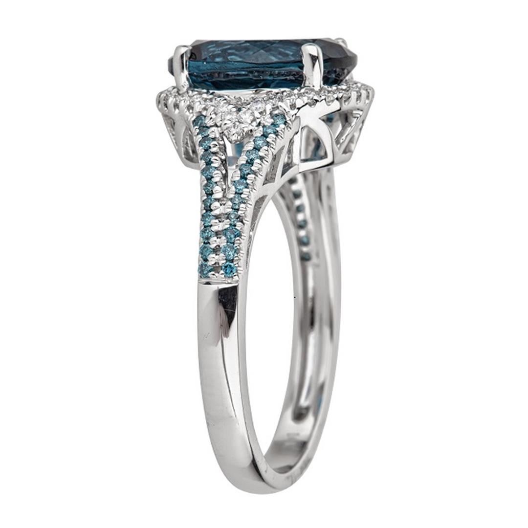 One Ring : 14KT white gold weighing 3.28gm containing one London blue topaz center stone with a total weight of 4.14ct, blue diamonds weighing 0.18ctw, and side diamonds weighing 0.15ctw.