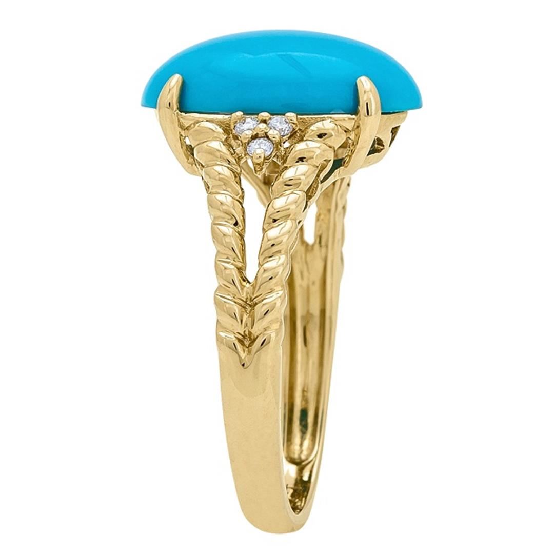One Turquoise and Diamond Ring featuring: 14KT Yellow Gold with a total weight of 2.94 grams, Turquoise with a total weight of 4.14ct, and Six Round Cut Diamonds with a total weight of 0.05ctw.