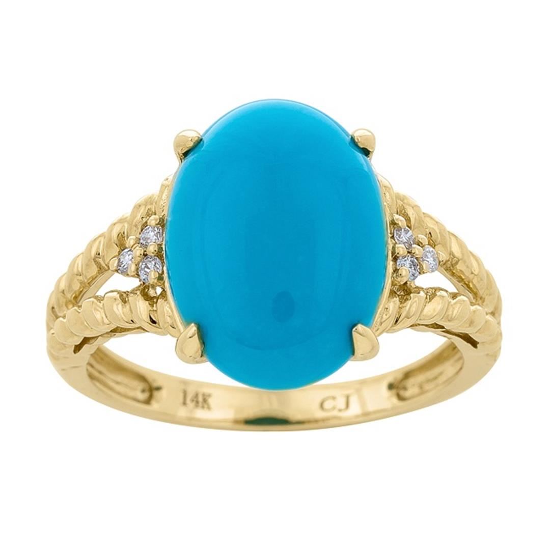 One Turquoise and Diamond Ring featuring: 14KT Yellow Gold with a total weight of 2.94 grams, Turquoise with a total weight of 4.14ct, and Six Round Cut Diamonds with a total weight of 0.05ctw.