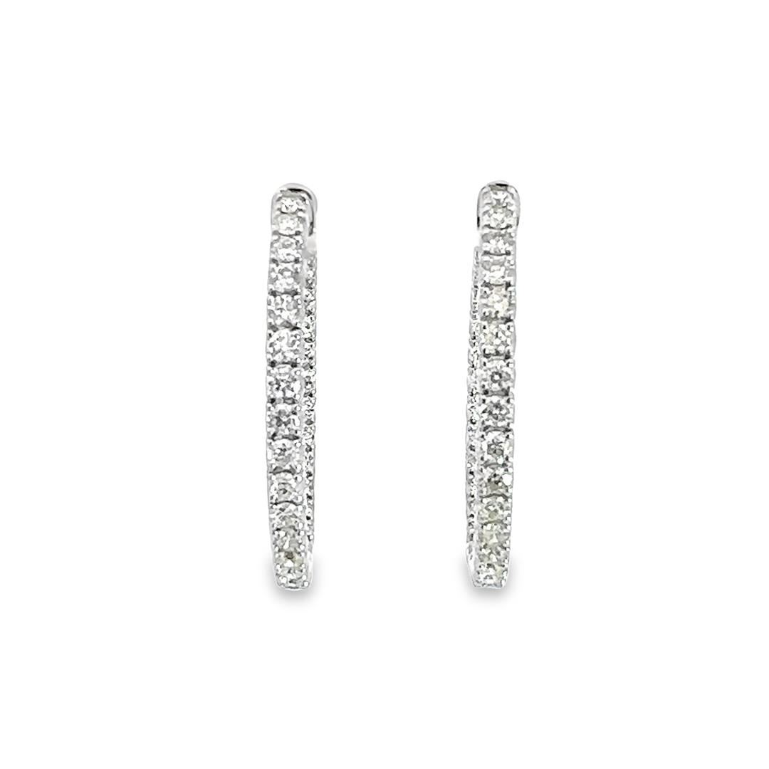 One pair electronically tested 14KT white gold lady's combination cast & assembled fashion inside-out hoop earrings with hinged, snap locking posts with a bright polish finish. The featured hoop earring has a diameter of 36.00 millimeter. Identified with markings of "14K". Condition is new, good workmanship.Containing: Sixty-Two prong set round brilliant cut diamonds, measuring 2.60 - 2.45 x 1.62mm (depth est.) approximate total weight of 62 Stones = 4.15ct. Graded in the setting.Color I - JClarity VS-2 to SI-1 Cut Very Good Total Weight of Diamonds 4.15ct. Total Weight of Earrings 12.40gm Estimated Retail Value 14150