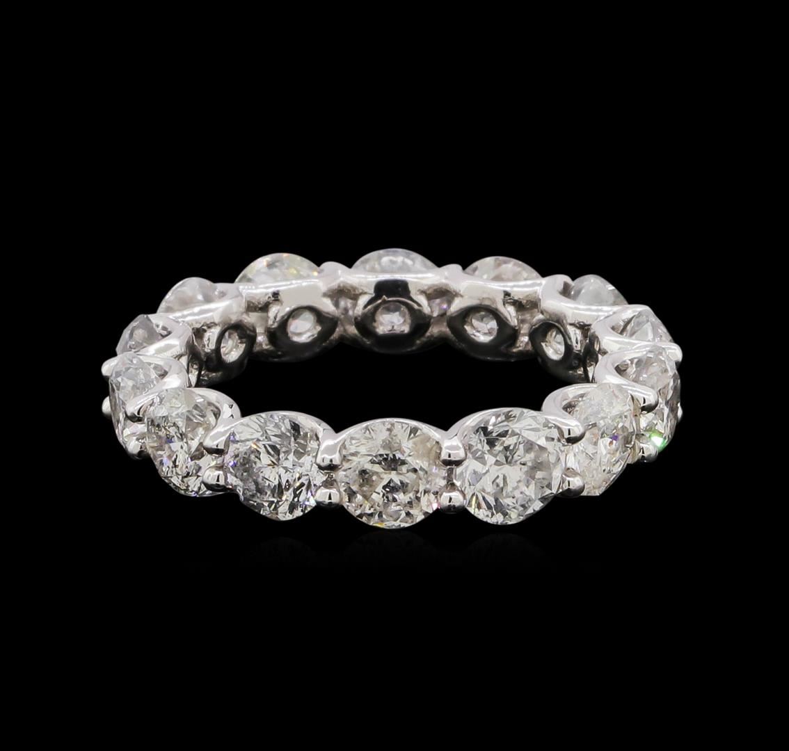 One electronically tested 14KT white gold ladies cast diamond eternity ring. The ring features a continuous four millimeter wide diamond ribbon. Bright polish finish. Ring size 5.0. Condition is new, good workmanship. Containing: Fourteen prong set round brilliant cut diamonds, measuring 4.40 - 4.20 x 2.58mm (depth est.) approximate total weight of 14 Stones = 4.15ct. Graded in the setting. Clarity I-1 to I-2. Color: G - I. Total Weight of Diamonds 4.15ct.. Total Weight of Ring 2.95gm. AIG Appraised at $11,945.00.