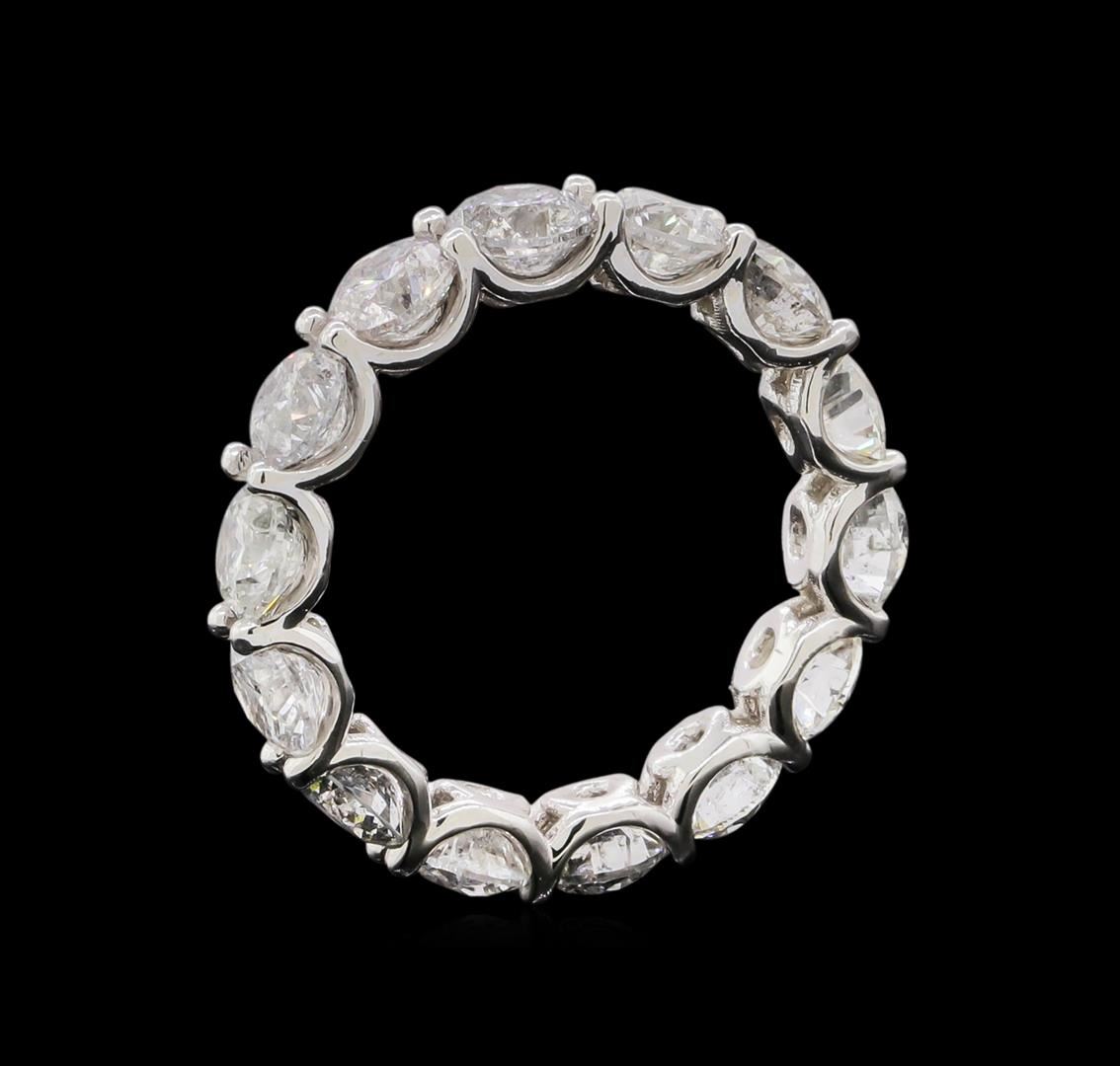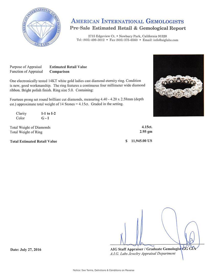 One electronically tested 14KT white gold ladies cast diamond eternity ring. The ring features a continuous four millimeter wide diamond ribbon. Bright polish finish. Ring size 5.0. Condition is new, good workmanship. Containing: Fourteen prong set round brilliant cut diamonds, measuring 4.40 - 4.20 x 2.58mm (depth est.) approximate total weight of 14 Stones = 4.15ct. Graded in the setting. Clarity I-1 to I-2. Color: G - I. Total Weight of Diamonds 4.15ct.. Total Weight of Ring 2.95gm. AIG Appraised at $11,945.00.