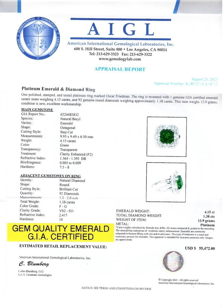 One polished. stamped. and tested platinum ring marked Oscar Friedman. The ring is mounted with 1 genuine GIA certified emerald center stone weighing 4.15 carats, and 92 genuine round diamonds weighing approximately 1.38 carats. This item weighs 13.9 grams, condition is new, excellent workmanship. #MAIN GEMSTONE# GIA Report No.: 6224483832; Species: Natural Beryl; ; Variety: Emerald; Shape: Octagonal; Cutting Style: Step Cut; Measurements: 9.95 x 9.49 x 6.50mm; Weight: 4.15 carats; Color: Green; Transparency: Transparent; Treatment: Clarity Enhanced (F2); Refractive Index: 1.564 - 1.595 DR; Birefringence: 0.005 to 0.009; Hardness: 7.5 - 8 #ADJACENT GEMSTONES ON RING# Identity: Natural Diamond; Shape: Round; Cutting Style: Brilliant Cut; Quantity: 92 Diamonds; Measurements: 1.3 - 2.0mm; Total Weight: 1.38 carats; Color Grade: F-G; Clarity Grade: VS2-SI1; Refractive Index: 2.417; Hardness: 10; EMERALD WEIGHT: 4.15 ct; TOTAL DIAMOND WEIGHT: 1.38 cts; WEIGHT OF ITEM: 13.9 grams; METAL: Platinum #Size: 7