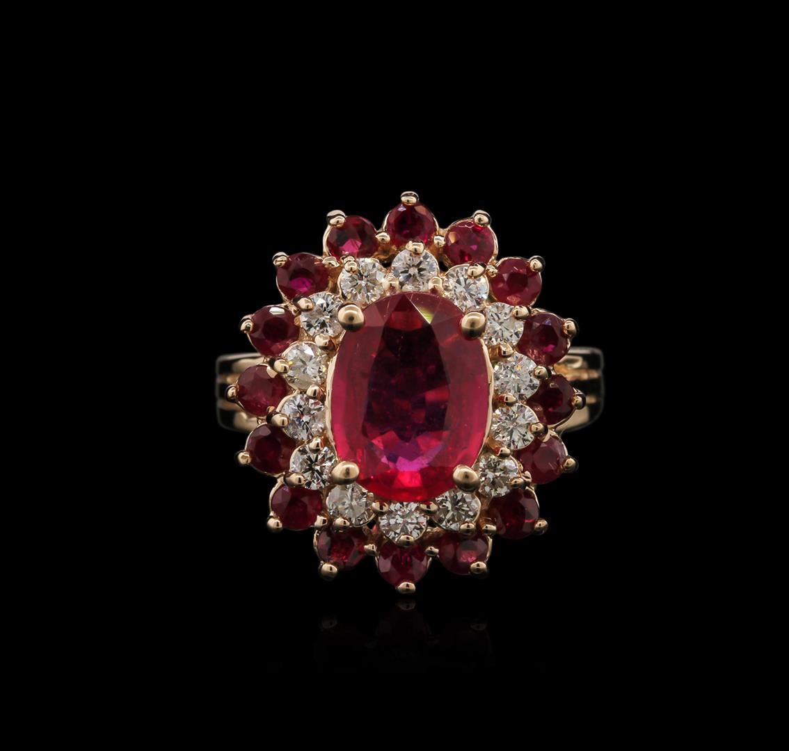 One ring featuring: 14KT rose gold weighing 7.70 grams containing one ruby center stone with a total weight of 2.77ct, 16 rubies with a total weight of 1.38ct and 14 diamonds with a total weight of 0.75ct.